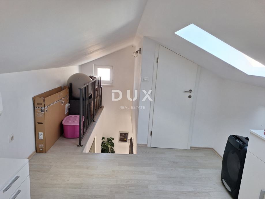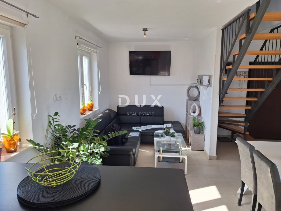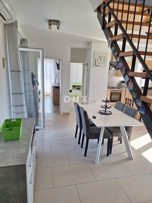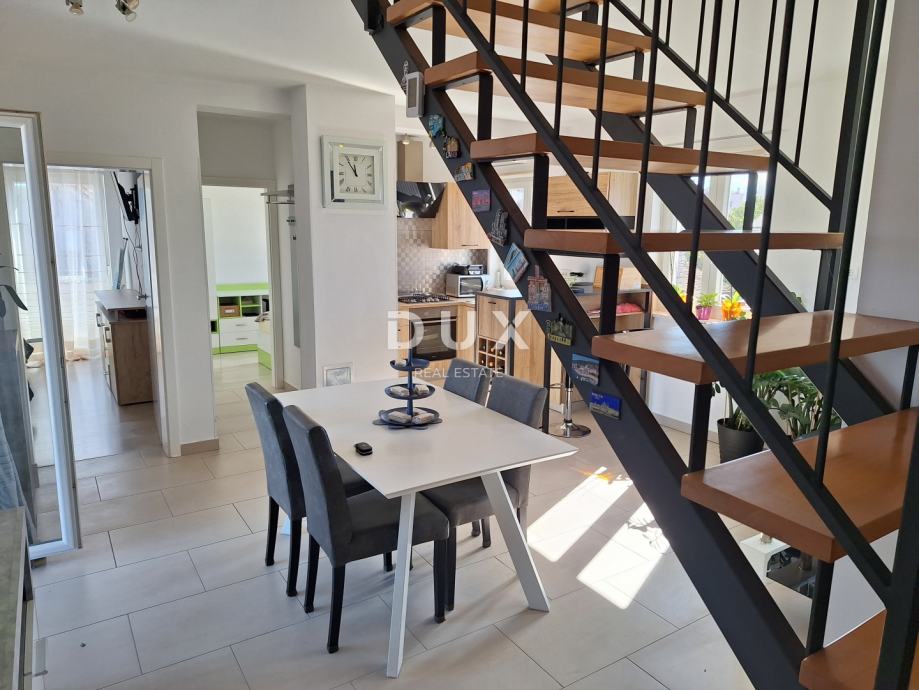 Na prodaju je prostran trosobni dvoetažni stan ukupne površine 88 m2. Na prvoj etaži od 57,10 m2 nalazi se kuhinja sa blagovaonicom i dnevnim boravkom iz kojeg se izlazi na lođu, kupaonica i dvije spavaće sobe. Unutarnje stepenice povezuju drugu etažu na kojoj se nalazi spavaća soba i wc i jedna prostorija koju vlasnici trenutno koriste kao spremište, sveukupne površine 24,90 m2 . Prostor je izuzetno funkcionalan i svijetao, što ga čini idealnim za obiteljski život u jednom od najtraženijih lokacija u mirnom gradiću.