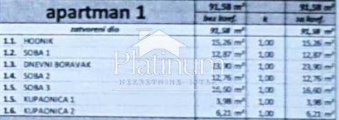 Banjole, prodaje se apatrman u prizemlju ukupne korisne površine površine 109,91m2 koji se sastoji od hodnika, tri spavaće sobe, dva kupatila i velikog dnevnog boravka s kuhinjom i blagovaonicom te pripadaka: dva vrta (bazne), vanjske stepenice (poseban ulaz) i parkirnog mjesta.