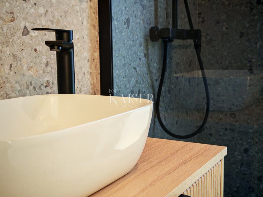 Zgrada i stanovi izgrađeni su s naglaskom na vrhunsku energetsku učinkovitost, trajnost i komfor stanovanja. Vanjska PVC stolarija s troslojnim staklima osigurava izvrsnu toplinsku i zvučnu izolaciju, dok aluminijske električne rolete pružaju dodatnu zaštitu i praktičnost. Fasada je izvedena u demit sustavu s izolacijom debljine 12 cm na katovima, dok je prizemlje dodatno oplemenjeno izolacijom od 8 cm i završnom oblogom od 2 cm prirodnog kamena Travertino Classico koji zgradi daje elegantan mediteranski karakter. Grijanje i hlađenje riješeni su putem Mitsubishi klima uređaja, dok dodatnu udobnost tijekom hladnijih mjeseci osigurava električno podno grijanje u svim prostorijama kojim se upravlja putem modernih Wi-Fi termostata. Podne obloge izvedene su od vrhunskih keramičkih pločica renomiranog talijanskog proizvođača Marca Corona, koje prostoru daju dojam luksuza i dugotrajne kvalitete.