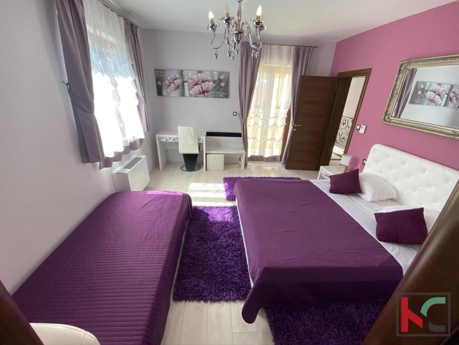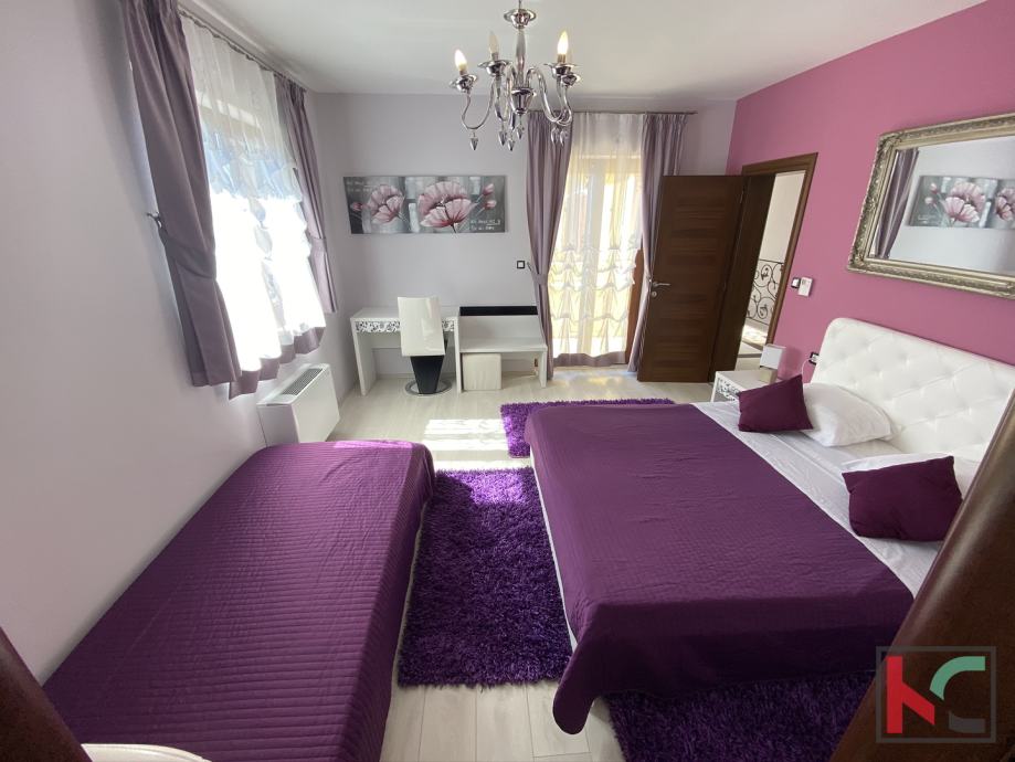 U prizemlju je smještena jedna spavaća soba s kupaonicom, dnevni boravak, blagovaonica i kuhinja, dok se na prvom katu nalaze četiri spavaće sobe s kupaonicama, te dvije terase s prekrasnim pogledom na more i uređenu okućnicu.