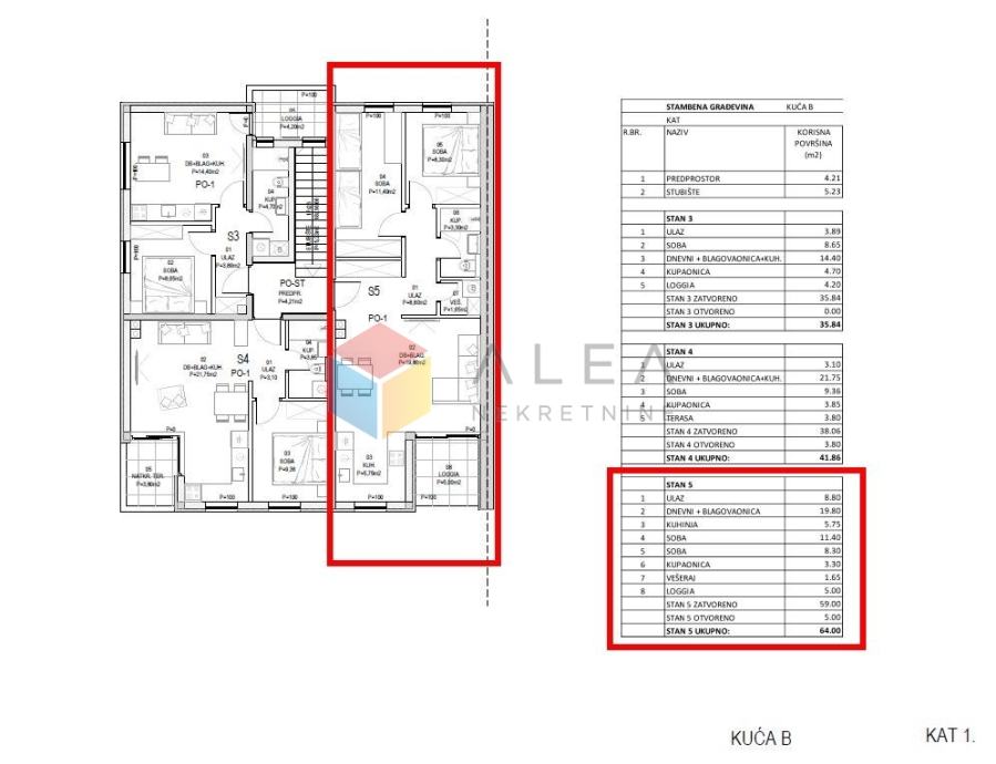 Prodaje se stan koji se nalazina 1.katu; stambene površine 64,00 m². Sastoji se od dvije spavaće sobe, loggie, kupaonice, praonice i prostora otvorenog koncepta koji ujedinjuje dnevni boravak, blagovaonicu i kuhinju.