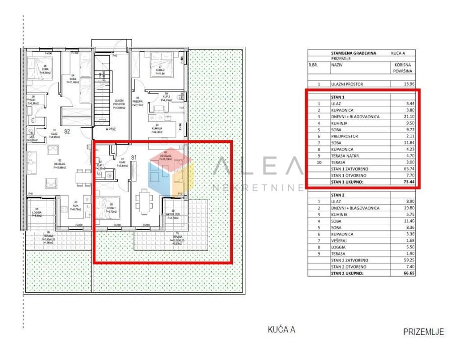 Prodaje se stan koji se nalazi u prizemlju zgrade; stambene površine 73,44 m². Sastoji se od dvije spavaće sobe, dvije kupaonice, i prostora otvorenog koncepta koji ujedinjuje dnevni boravak, blagovaonicu i kuhinju s izlazom na prostranu terasu.