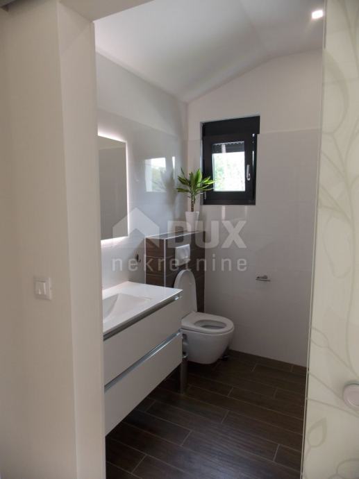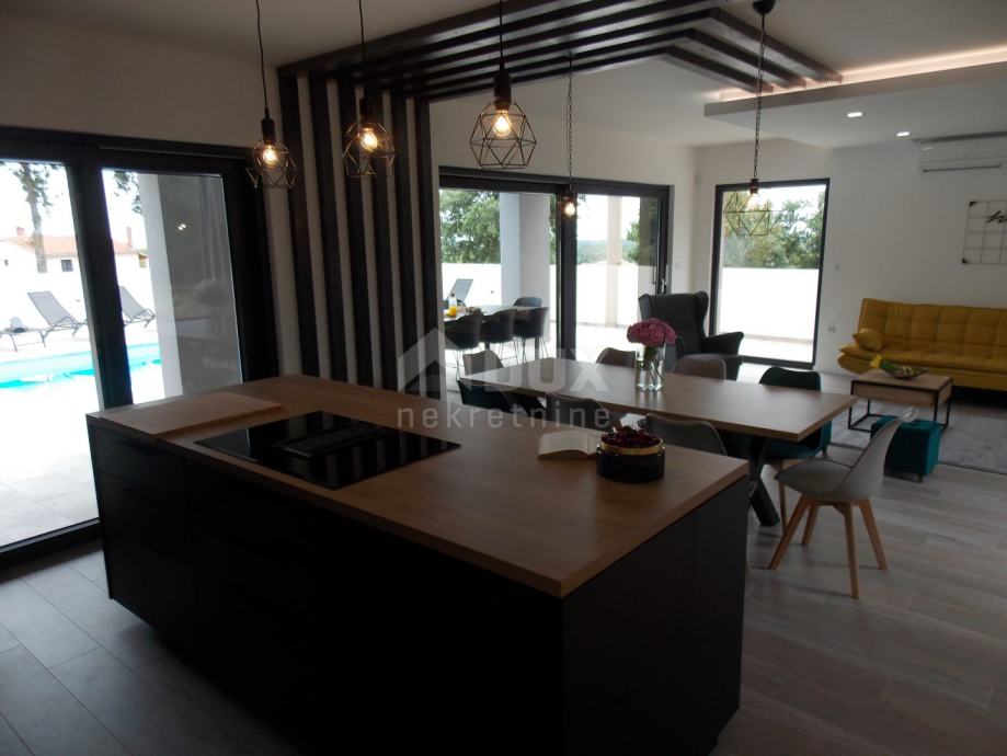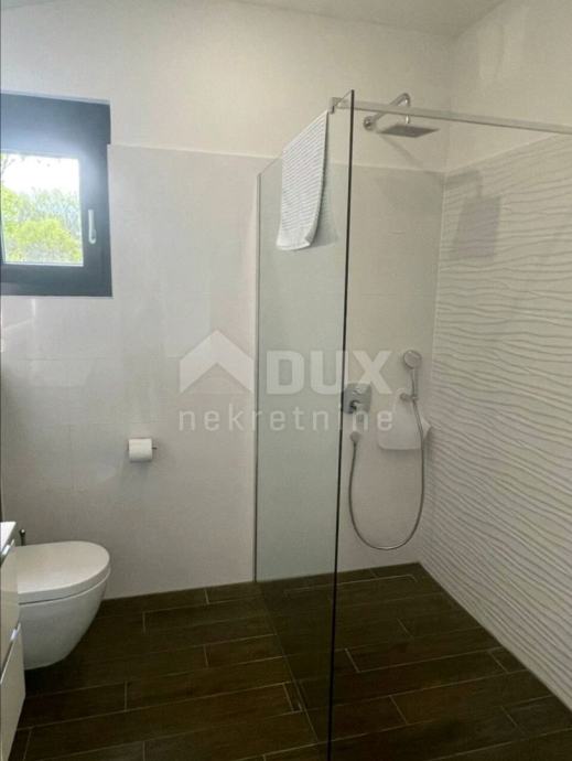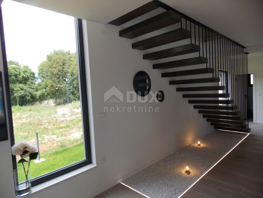 Proteže se kroz dvije etaže prizemlje i kat. U prizemlju se nalazi vešeraj sa spremištem, WC, kuhinja opremljena najsuvremenijom tehnologijom kao što su integrirana napa u staklokeramičkoj ploči za kuhanje, ugradbena mikrovalna pećnica, pećnica te hladnjak sa zamrzivačem, blagovaonica i dnevni boravak projektirano po principu open space iz kojeg se izlazi na ljetnu kuhinju sa roštiljem, bazen površine 30m2 te sunčalište. Unutarnjim stepenicama se ide na kat gdje se nalaze tri spavaće sobe svaka s vlastitom kupaonicom. Dvije spavaće sobe dijele zajedničku terasu površine 13 m2. Sa vanjske strane, odvojena od kuće nalazi se strojarnica sa spremištem površine 20m2.
