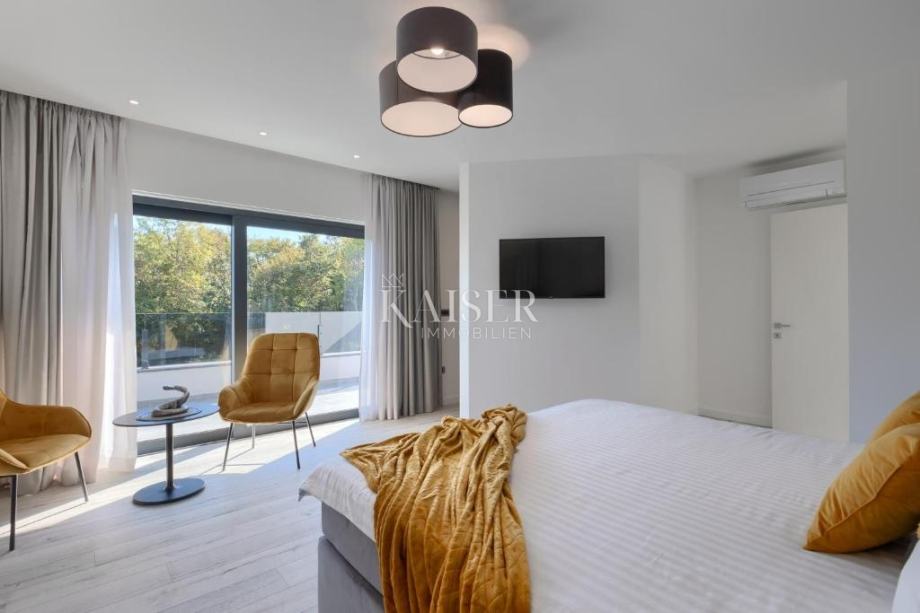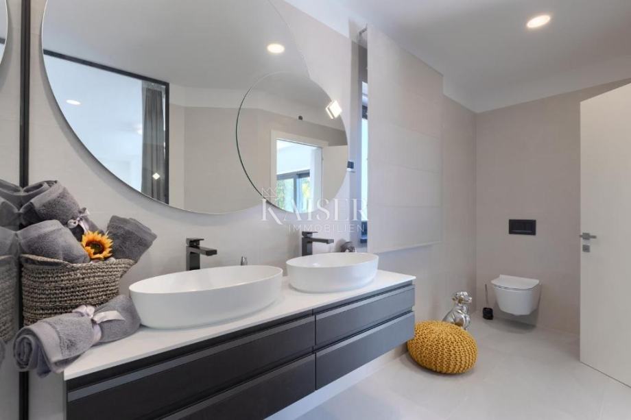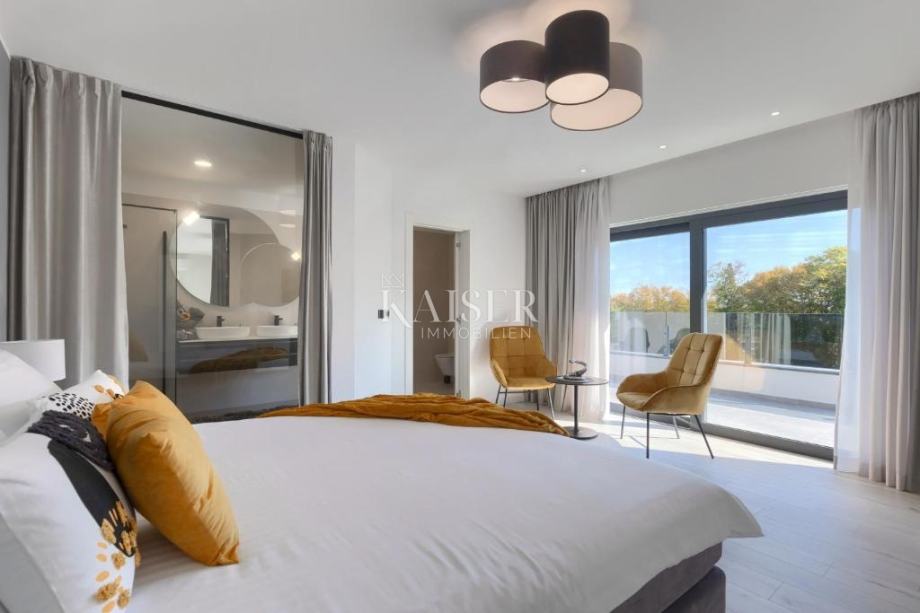 Na katu se nalaze dvije spavaće sobe. Obje pružaju kupaonicu, garderobu te terasu s pogledom na prirodu kraja.