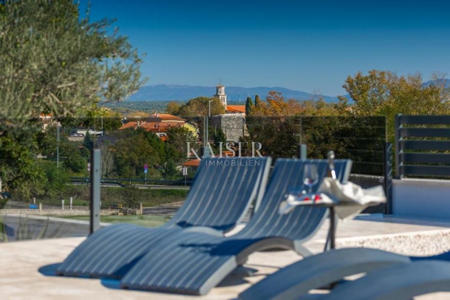 Pogledi se pružaju na srednjovjekovnu jezgru grada te na prirodu kraja, planine Učka i Sisol.