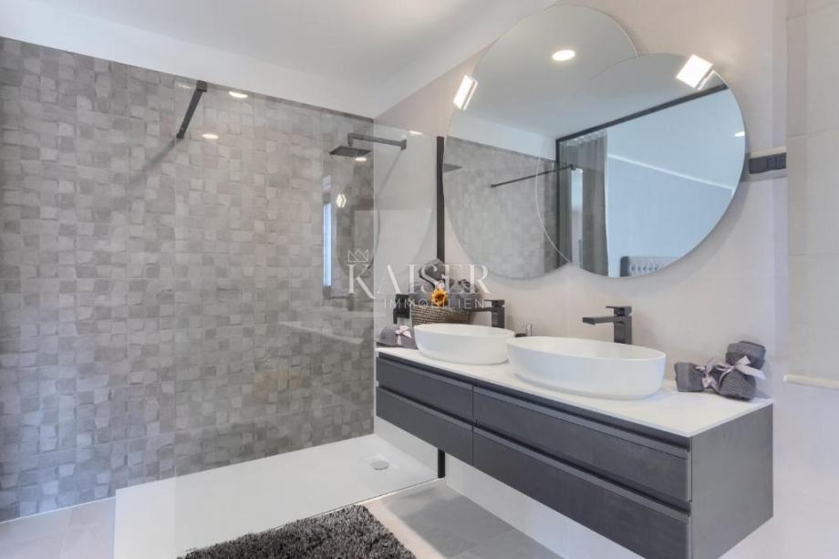 U prizemlju se nalazi otvoreni prostor namijenjen kuhinji i dnevnom boravku, pruža izlaz na sunčalište bazena te uređenu okućnicu s pregršt prostora za svakodnevna druženja. Prizemlje također pruža i spavaću sobu s garderobom i kupaonicom, soba je veoma prostrana i puna prirodnog svijetla.
