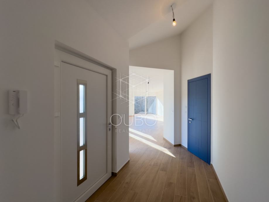 Riječ je o prizemnici s tri spavaće sobe i dva kupatila, opremljenoj prema najvišim standardima današnjice – uključujući električno podno grijanje u cijelom objektu, klima uređaje u svakoj prostoriji i napredno upravljanje toplinom pomoću dizalice topline i solarnih panela (8 kW).