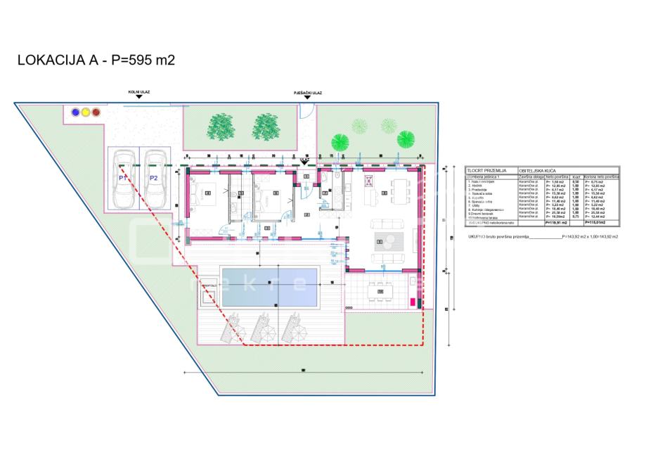 Okućnica kuće bit će ograđena i uređena; dvorišna vrata na automatsko otvaranje, travnjak sa sistemom automatskog navodnjavanja, bazen površine 28 m2 s popločenim sunčalištem, dva parkirna mjesta, posađeno mediteransko bilje.