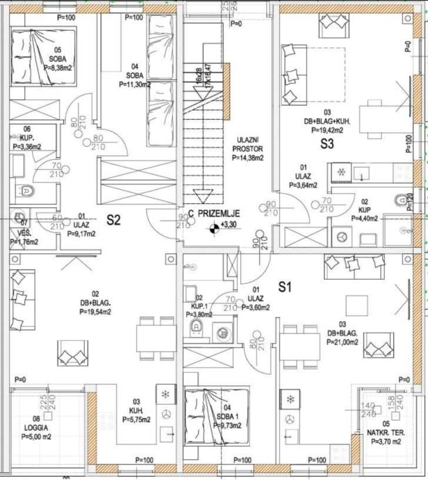 Prodaje se dvosoban stan S2 s terasom na 1.katu u izgradnji. Stan se sastoji od ulaznog dijela, kuhinje s blagovaonicom i dnevnim boravakom, dvije spavaće sobe, vešeraja i loggie. Stan se prodaje po principu "ključ u ruke" što uključuje: