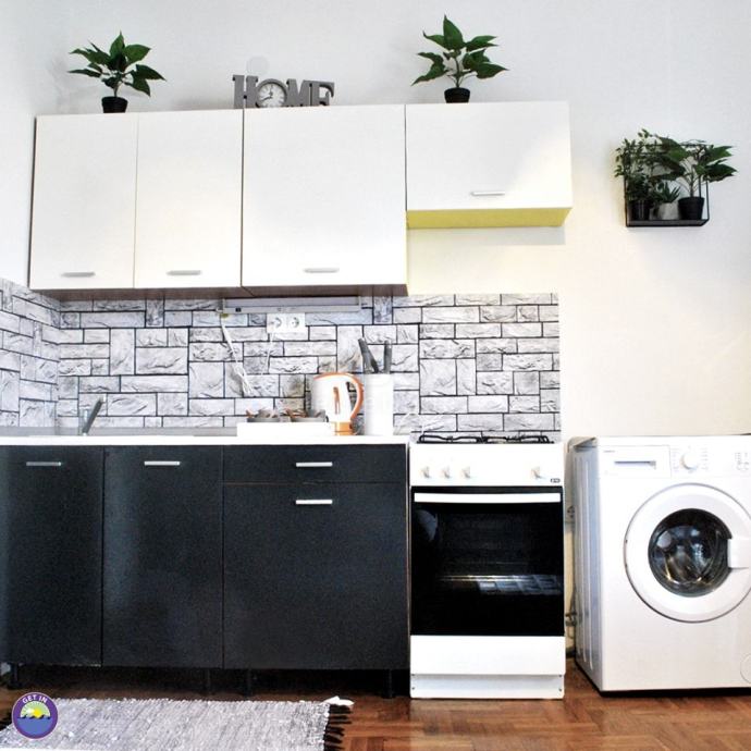 * Tako prvi studio apartman od 55 m2 stambenoga prostora se sastoji od 2 komotne spavaće sobe, kupatila, te u jednom open space prostoru kuhinja s blagovaonom i dnevnim boravkom.
