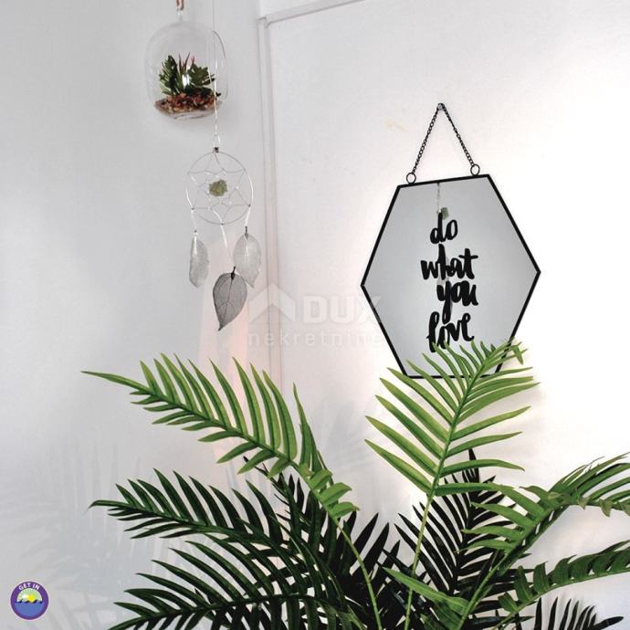 * Od svojih 120m2 stambenoga prostora, a sastoji se od ulaznog predvorja koje ujedno služi i kao zatvorena terasa s pomičnim stijenkama, zatim pristupa se većem i prostranom open space prostoru u kojemu se nalazi veliki dnevni boravak, veća blagovaona i kuhinja. Cijeli se prostor osvijetljen dnevnim svijetlom s obzirom na to kako se iz istoga proteže izlaz na vanjsku terasu s djelomičnim pogledom na more. Zatim u privatnom dijelu stana smjestilo se kupatilo, WC i dvije spavaće sobe.