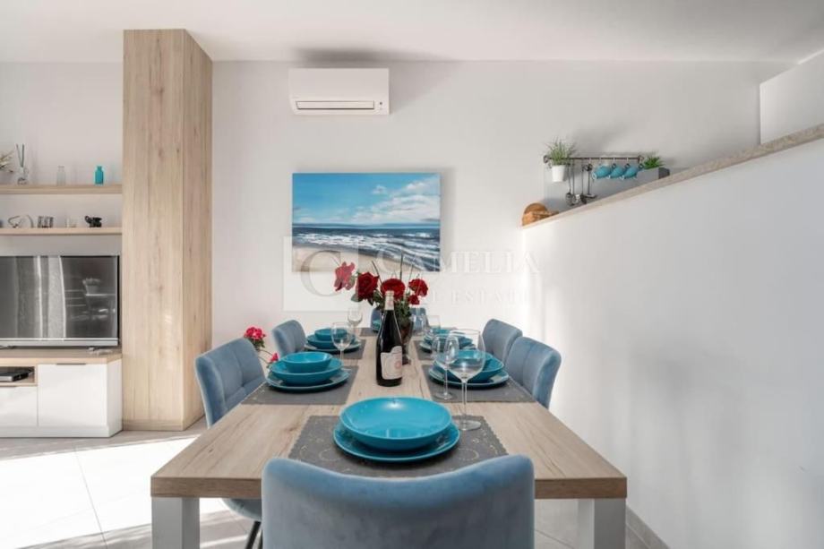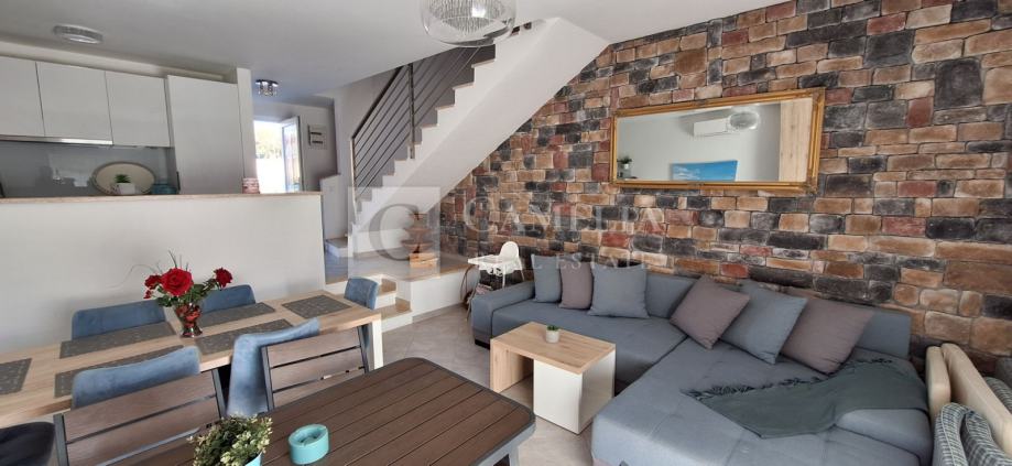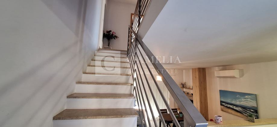 U prizemlju je prostrani dnevni boravak sa blagavaonicom i potpuno opremljenom kuhinjom sa perilicom posuđa te wc sa perilicom rublja.
