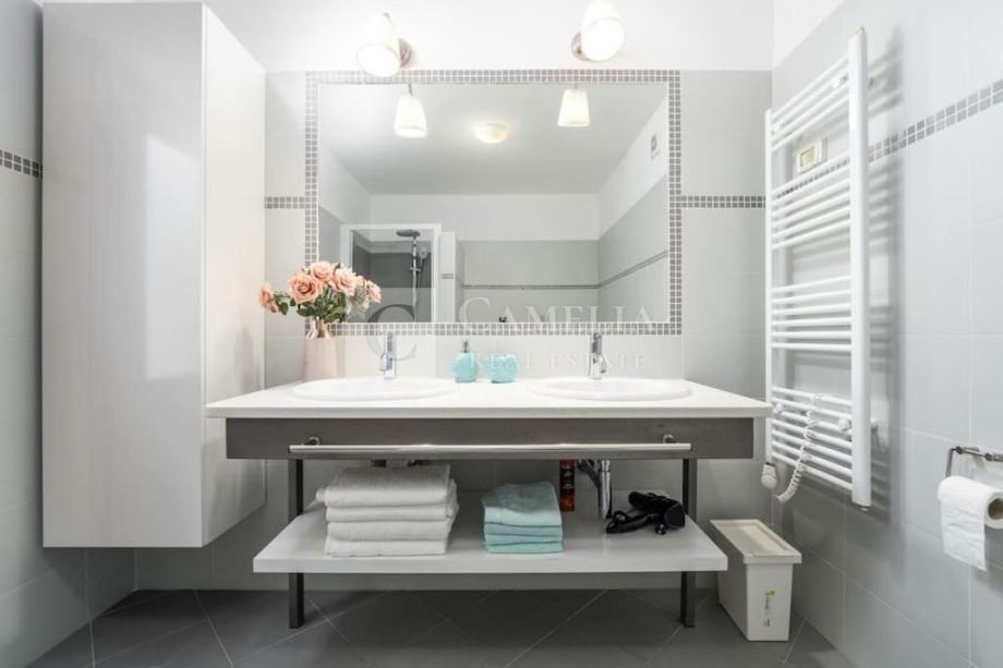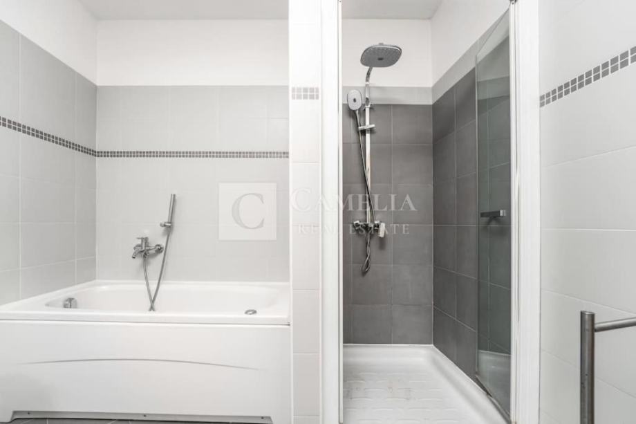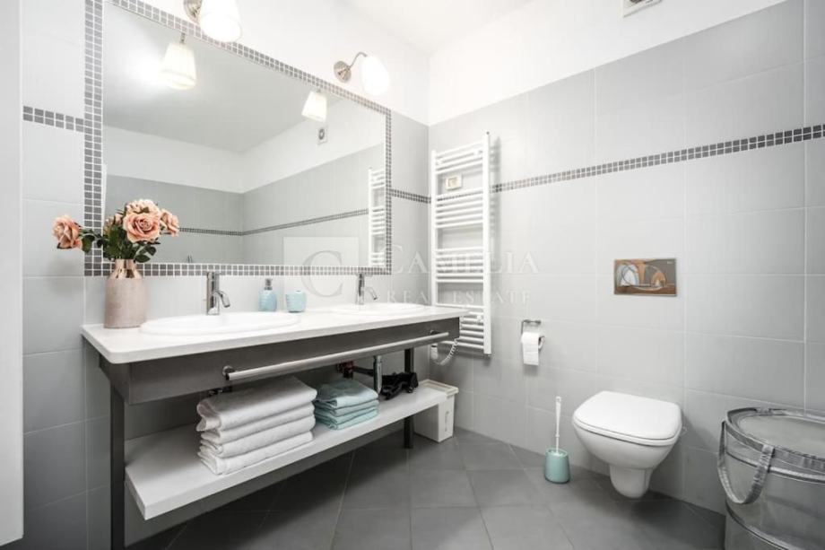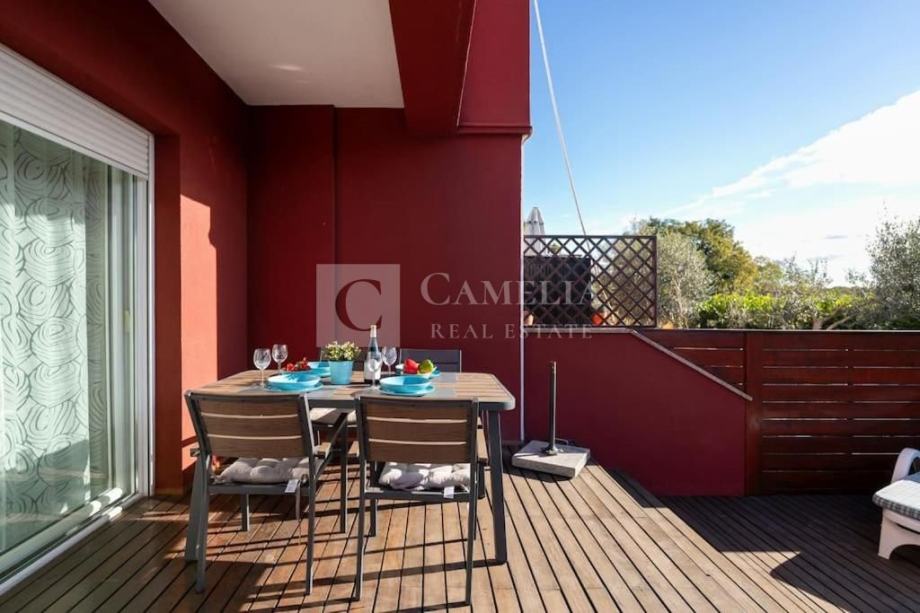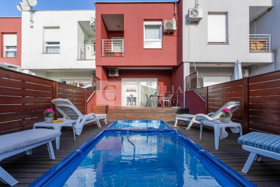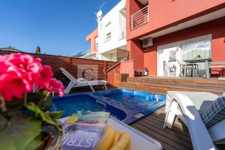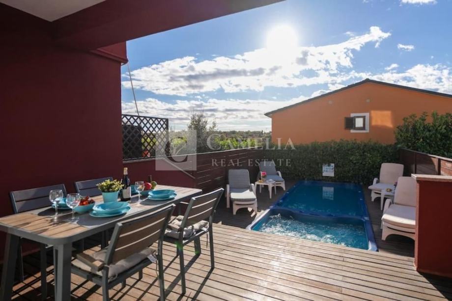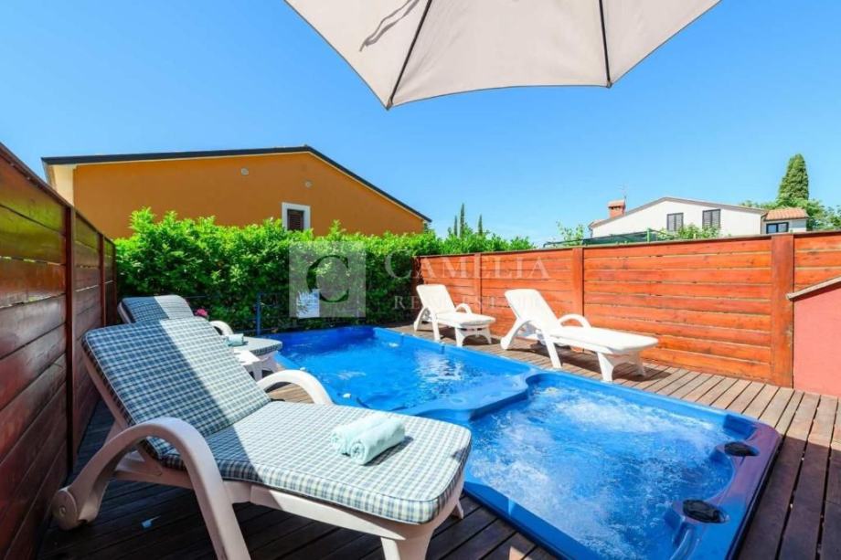 Iz dnevnog boravka se izlazi na lijepu terasu prekrivenu drvenim dekingom u sklopu koje je hidro masažni bazen površine 8m2 i ležaljke.