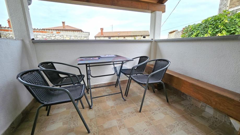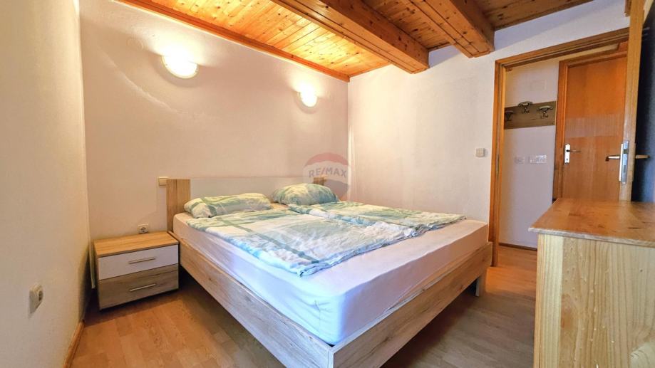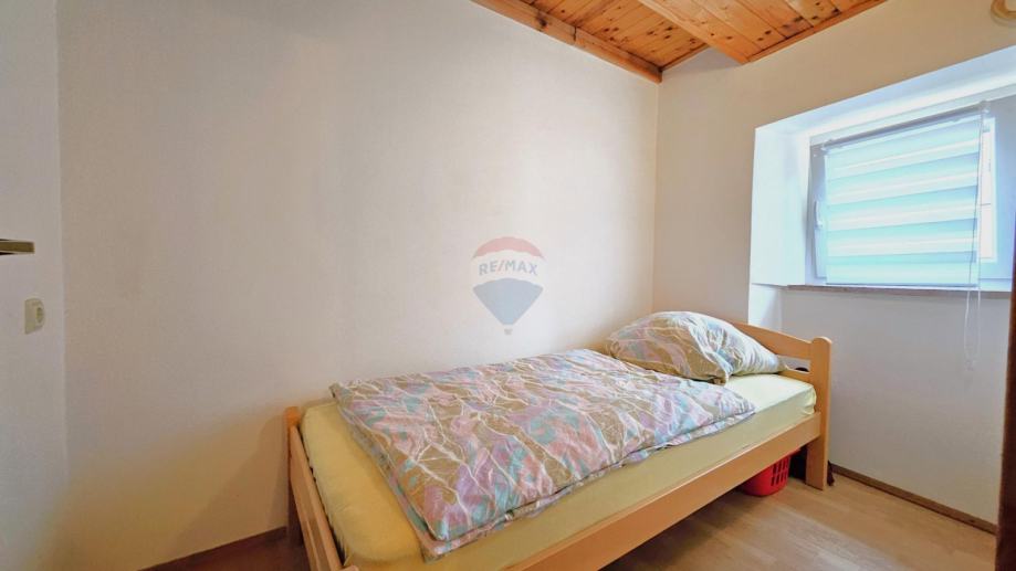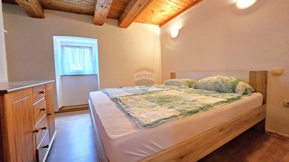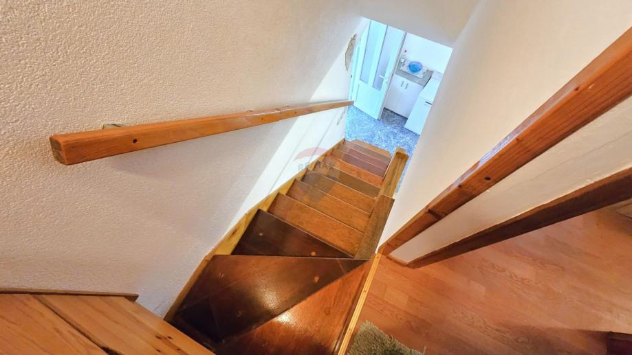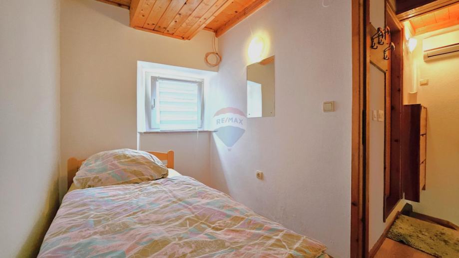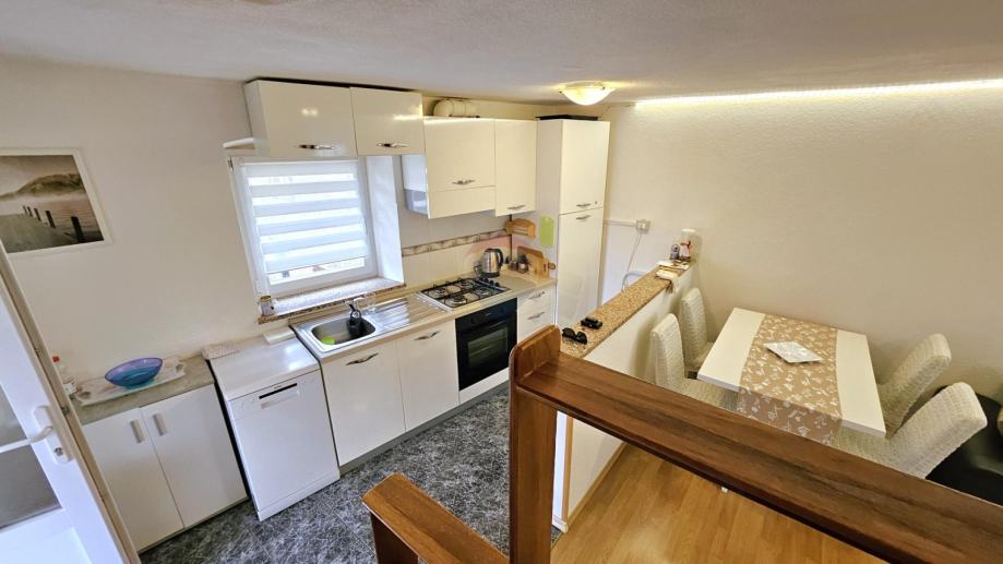 Vanjskim stepenicama dolazi se na prostranu loggiu koja vodi do glavnog ulaza u kuću. Na prvom katu smješten je dnevni boravak s blagovaonicom i kuhinjom, dok se na gornjoj etaži nalaze dvije udobne spavaće sobe i kupaonica. Grijanje i hlađenje je pomoću dva zasebna klima uređaja.