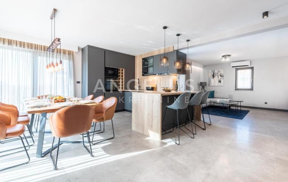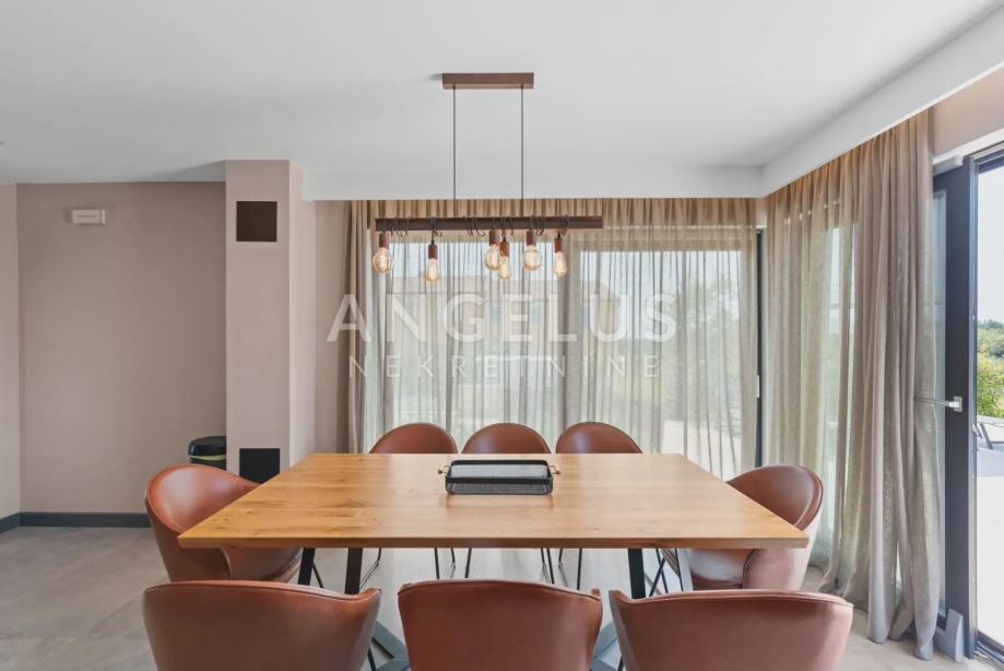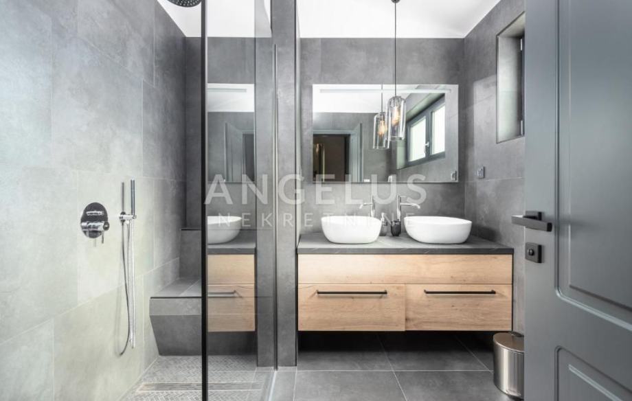 Kuća je opremljena modernim i kvalitetnim namještajem, te se namještena i iznajmljuje. Grijanje je osiigurano putem peći na pelete i klima uređaja kojih ima ukupno 4 komada (u svakoj sobi po jedna). Iz dnevnog boravka u prizemlju se izlazi na terasu pored koje se nalazi bazen sa sunčalištem. Terasa zajedno sa bazenom i sunčalištem zauzima središnje mjesto ove okućnice. Ostatak okućnice ispunjen je uređenim zelenim travnjakom, dok kuća posjeduje i svoja 2 vlastita parkinga na korištenje najmoprimcima. Vanjski bazen je dimenzija 10 x 3,5 m.
