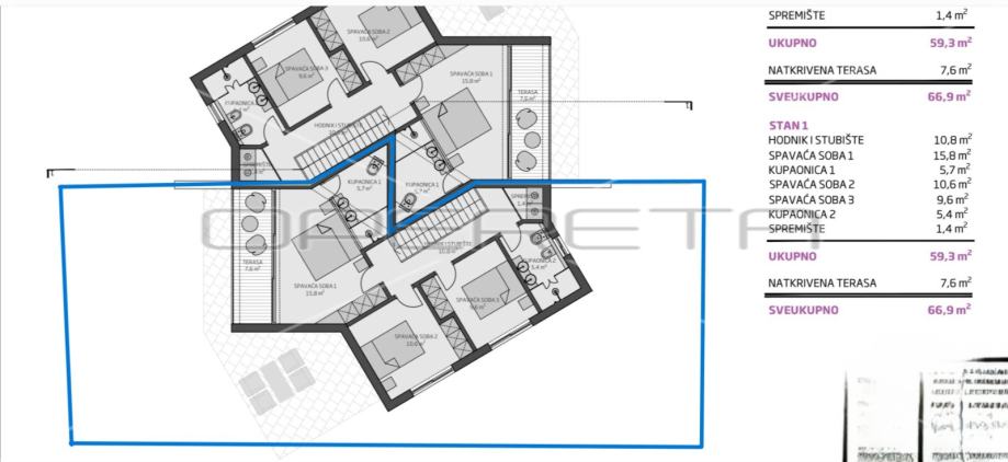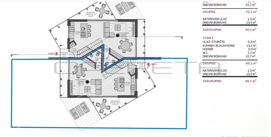 Kuća se prostire na 116 m² uz vanjski bazen i dva parkirna mjesta. Kuća se sastoji od dvije etaže. U prizemlju se nalazi open space prostor u kojem su smješteni dnevni boravak, kuhinja i blagovaonica s izlazom na natkrivenu terasu, te toalet. Dok su na katu smještene tri spavaće sobe, od koji jedna spavaća soba ima vlastitu kupaonicu i izlaz na terasu, te zajednička kupaonica za preostale dvije spavaće sobe.