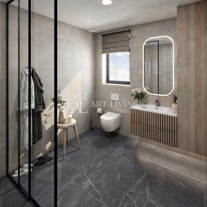 Prostrana krovna terasa sa panoramskim pogledom na prelijep istarski krajolik, idealna je za uživanje u toplim ljetnim večerima, pružajući dašak luksuza, udobnosti i komfora.