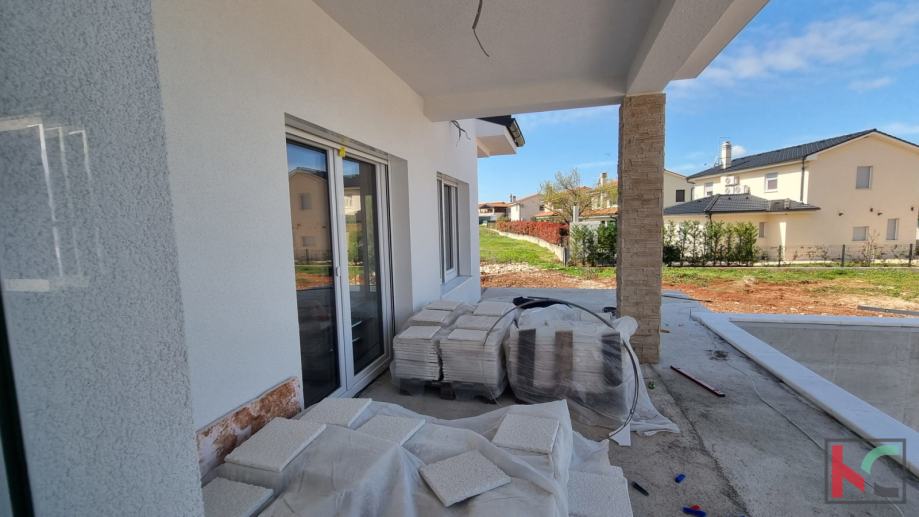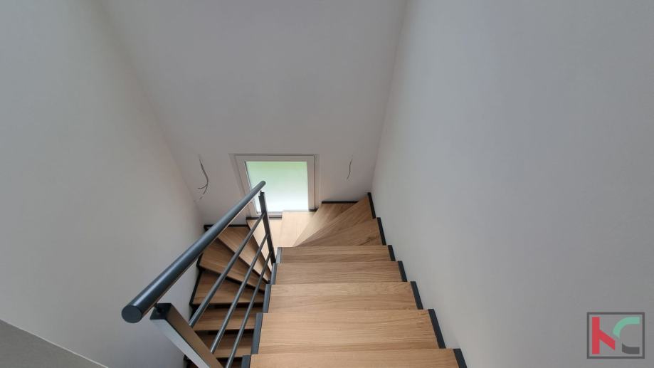 U prizemlju se nalazi dobro osmišljeni dnevni prostor s kaminom i kuhinjom te izlazom na natkrivenu terasu i bazen, wc, te spremište.
