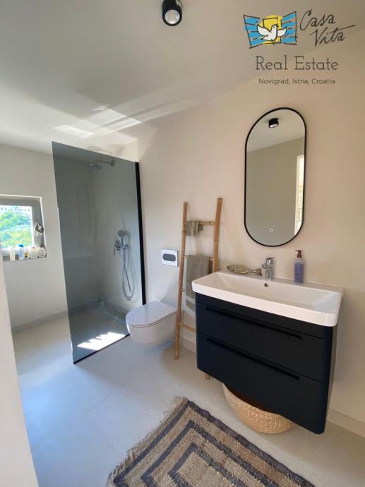 Kuća ima 210m2 te je orijentirana prema jugozapadu, što osigurava obilje prirodne svjetlosti i vrlo sunčane prostore. Raspolaže s tri spavaće sobe svaka sa svojom kupaonicom pružajući dovoljno prostora za obitelj ili one koji traže dodatne radne ili gostinjske sobe. Zbog renovacije izvršene 2023. godine, interijer odiše suvremenim dizajnerskim rješenjima i visokim standardom uređenja.