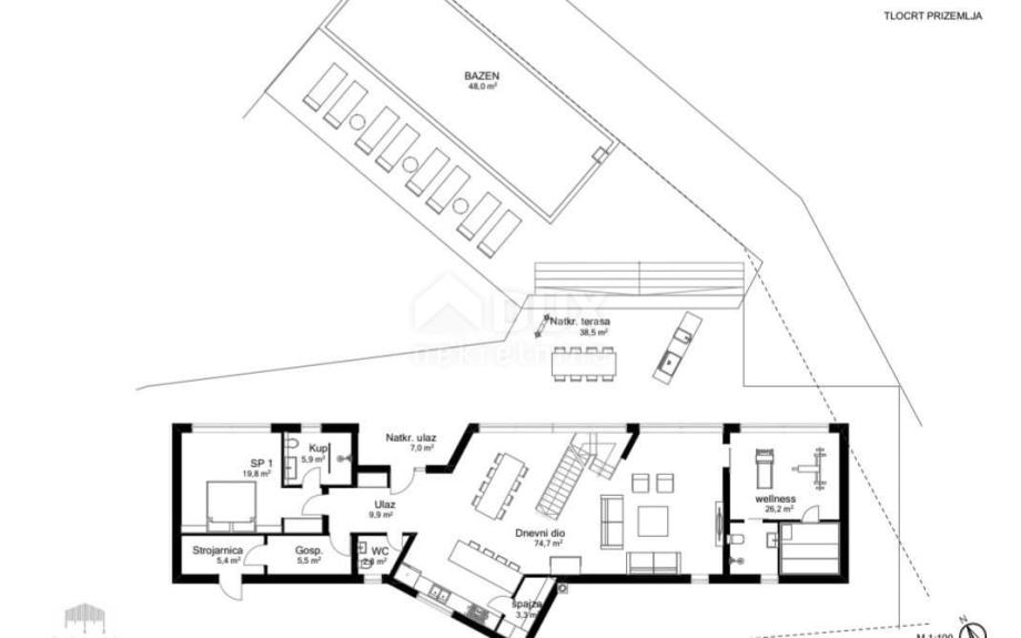 Projekt sadrži i bazen od 48m2 te teniski teren i parking.