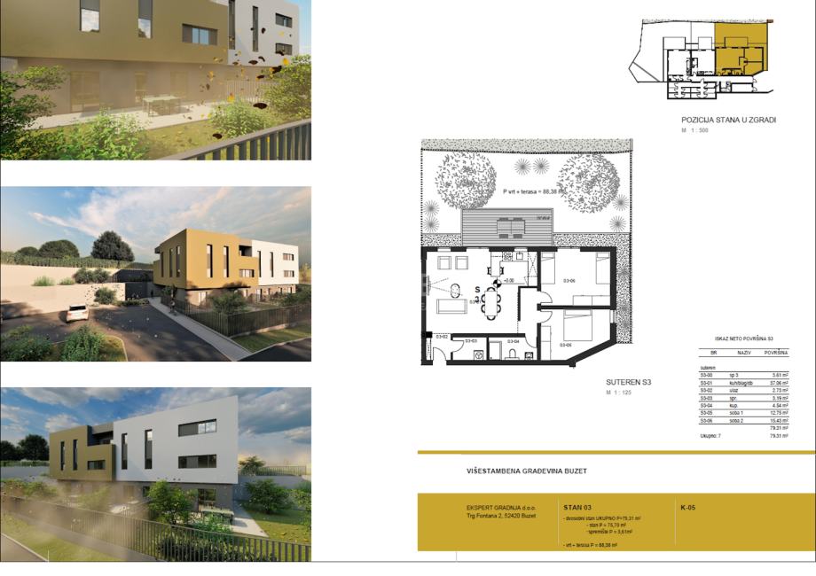 Stanu S3 pripada spremište 3,61 m2, vrt + terasa 88,38 m2.