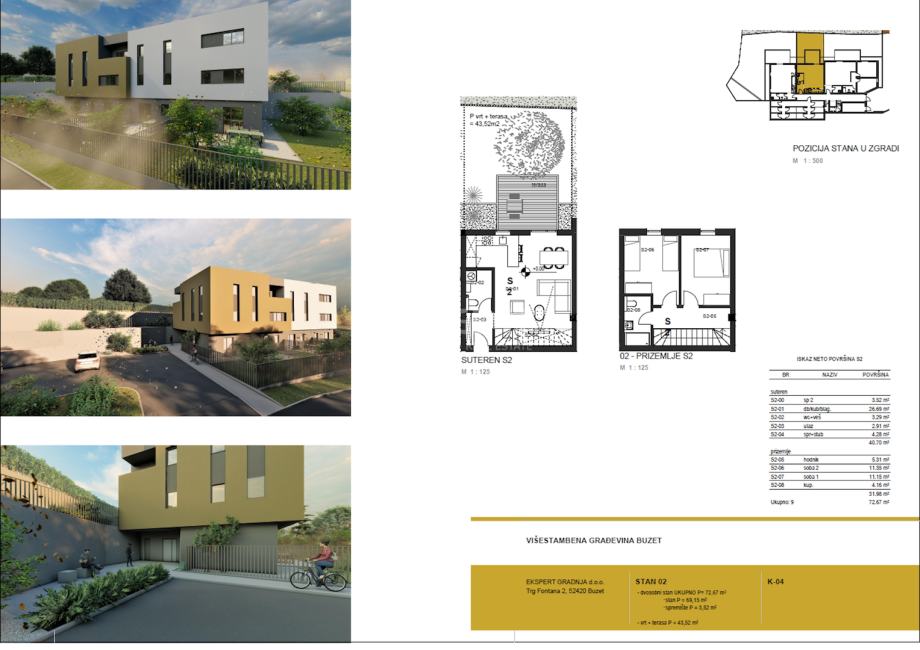 Stanu S2 pripada spremište 3,52 m2, vrt + terasa 43,52 m2.