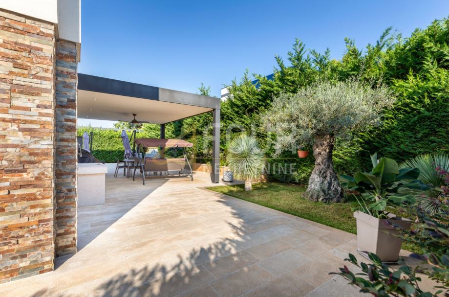 Na uređenoj okućnici, površine 505m2 nalazi se grijani bazen (na dizalicu topline), hidromasažni bazen te natkrivena terasa sa stolom za ugodno druženje i blagovanje.