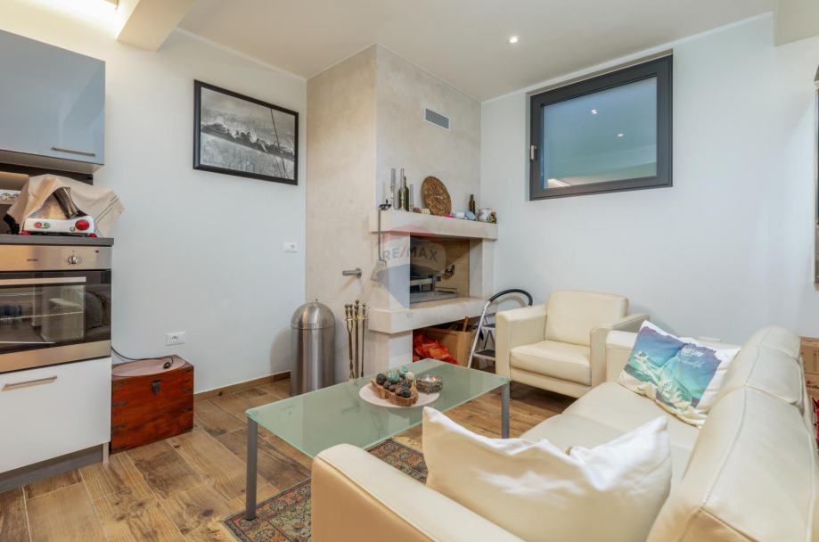 U prizemlju se nalazi ulazni prostor sa velikim ugradbenim ormarima i toaletom, prostrani dnevni boravak sa blagavaonicom, kuhinja sa direktnim izlazom na terasu, te jedna spavaća soba sa vlastitim kupatilom.