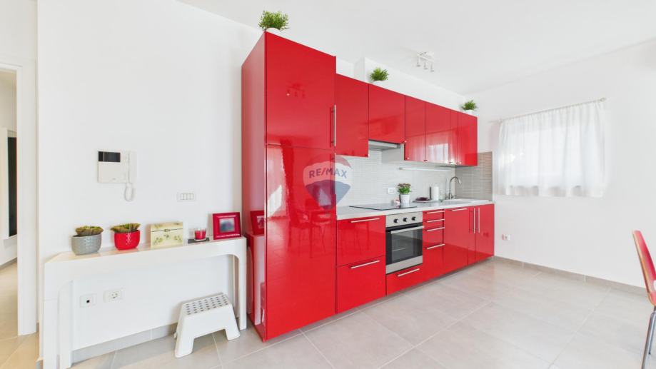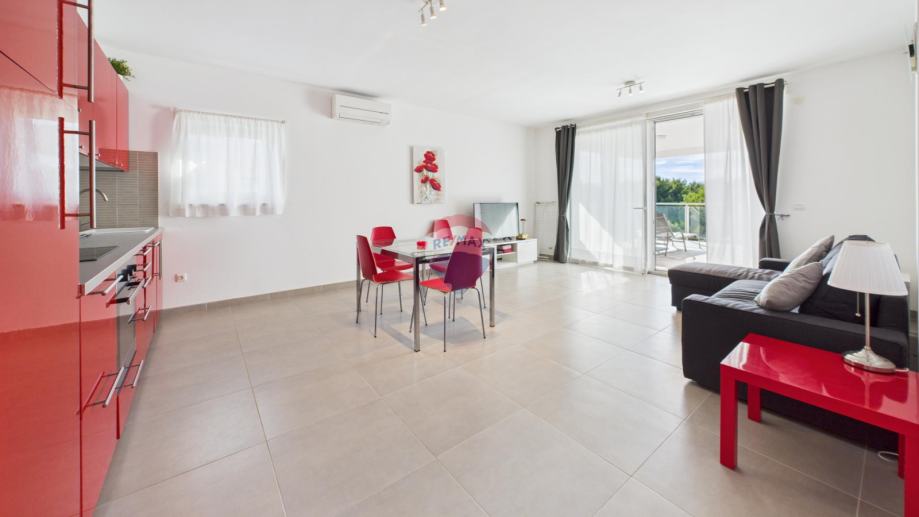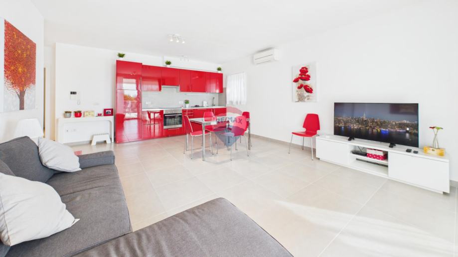 Stan se sastoji od prostranog dnevnog boravka i kuhinje s izlazom na veliku terasu, dvije spavaće sobe i kupatila, te jednog parking mjesta.