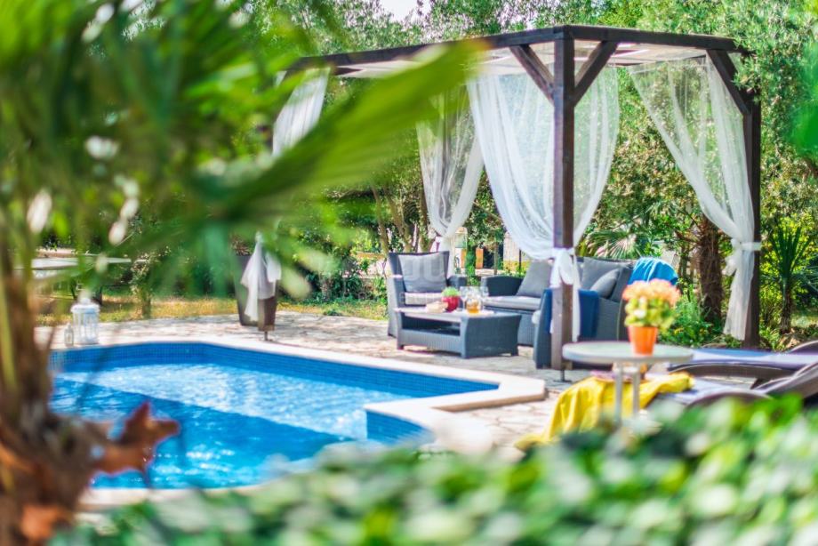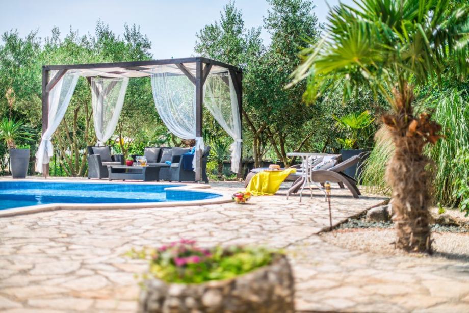 Vanjski prostor koji je jednako tako uređen u pravome istarskome duhu s istaknutim kamenim detaljima i domaćem bilju, dovoljne je površine za zabavu s prijateljima i obitelji. U tome će vam zasigurno, sa stražnje strane kuće, pomoći i natkrivena ljetna terasa s većim roštiljem i blagovaonskim stolom, te uz njih i originalna te funkcionalna krušna peć kao i prostrano zemljište koje se nalazi uz kuću sa stražnje strane, ukupne kvadrature 1183m2. Na kojemu se nalazi prostrani bazen sa sunčalištem, prostor za odmor i opuštanja te tehnička prostorija sa spremištem. S prednje strane kuće nalazi se manji dio okućnice koji je dovoljne površine za parking 4 automobila.