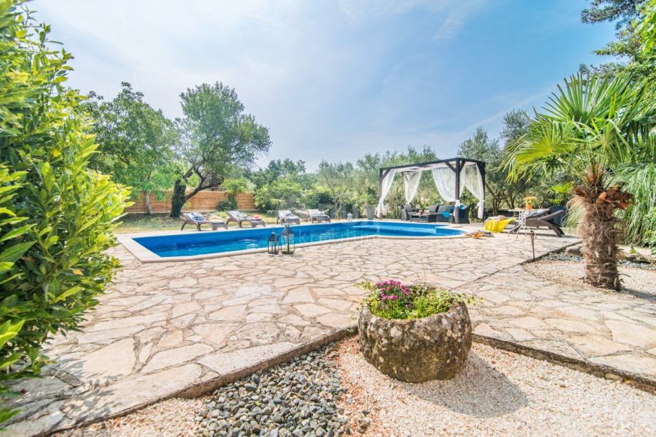 Vanjski prostor koji je jednako tako uređen u pravome istarskome duhu s istaknutim kamenim detaljima i domaćem bilju, dovoljne je površine za zabavu s prijateljima i obitelji. U tome će vam zasigurno, sa stražnje strane kuće, pomoći i natkrivena ljetna terasa s većim roštiljem i blagovaonskim stolom, te uz njih i originalna te funkcionalna krušna peć. Na okućnici ostalo je dovoljno prostora za dodavanja sadržaja sukladno želji i potrebi budućih vlasnika.
