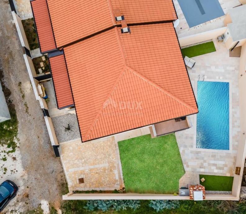 Dvorište je vile ograđeno zidom, te je uređeno u gotovo jednakom modernom stilu kao i unutrašnjost vile, čime se osigurala jednostavnost u održavanju okućnice. Pristupom okućnici iz slijepe ulice nalaze se dva parking mjesta, koje budući vlasnici imaju priliku natkriti. Centralni dio dvorišta ipak zauzima bazen od 27 m2, a uz bazen smjestila se natkrivena ljetna terasa, prostrano sunčalište, kao i roštilj, te sjedeća garnitura idealna za odmor i opuštanje uz čašu vama najdražega vina.