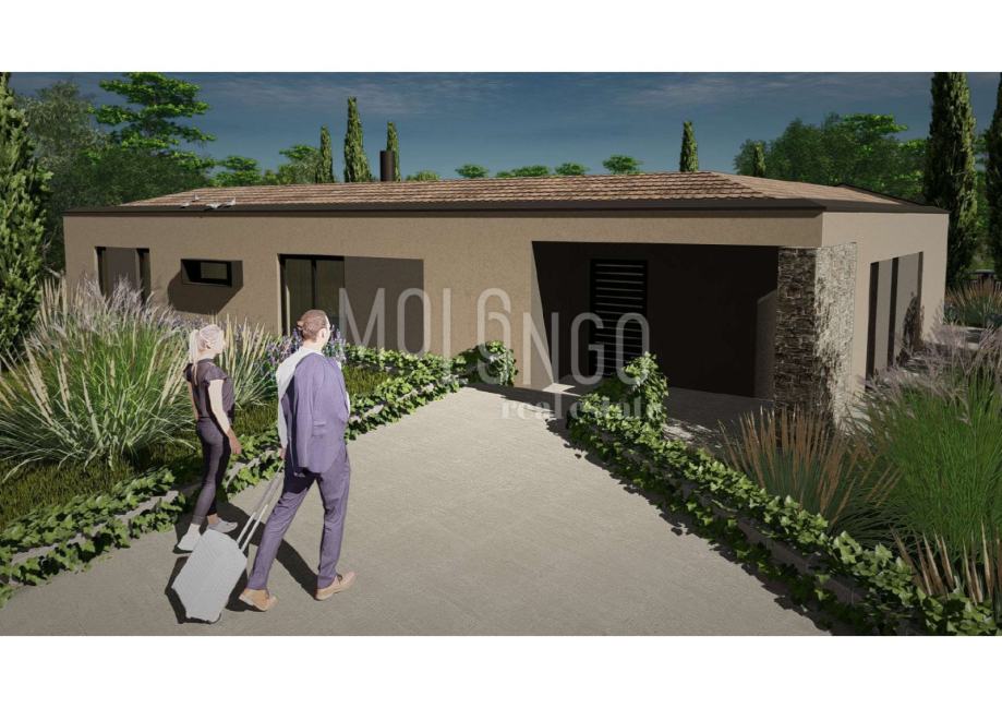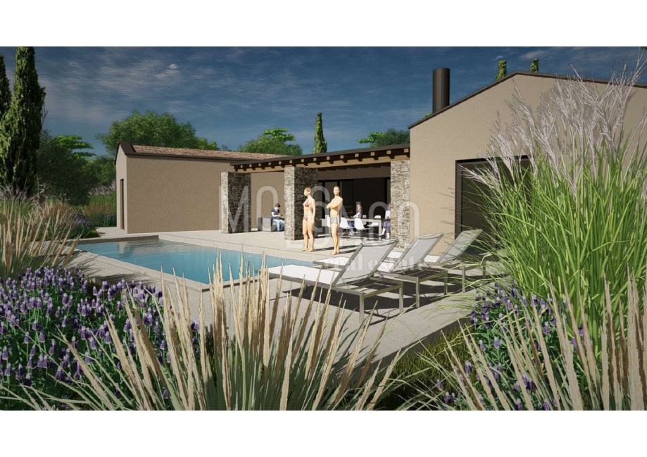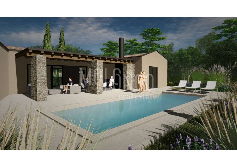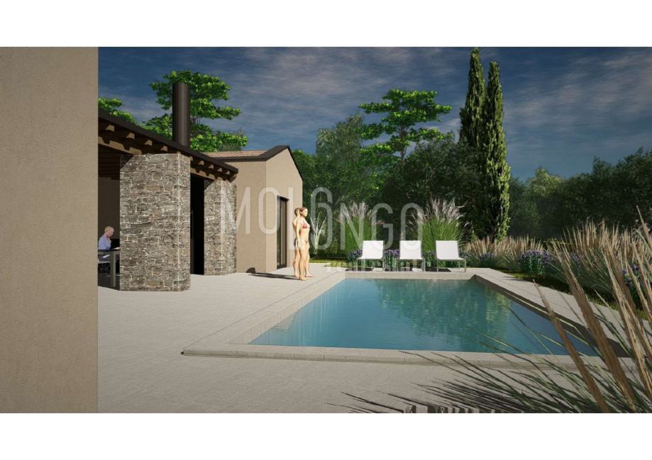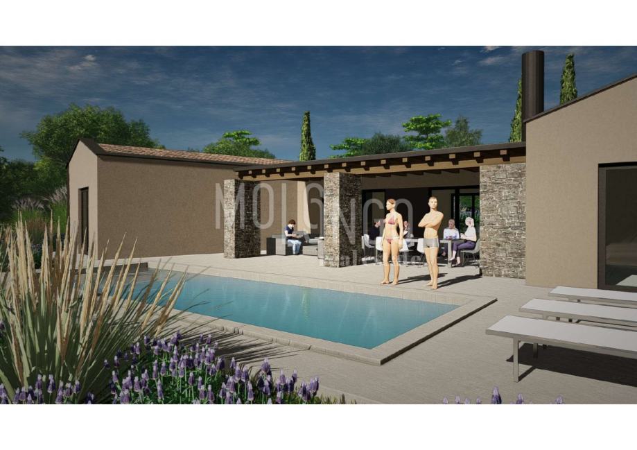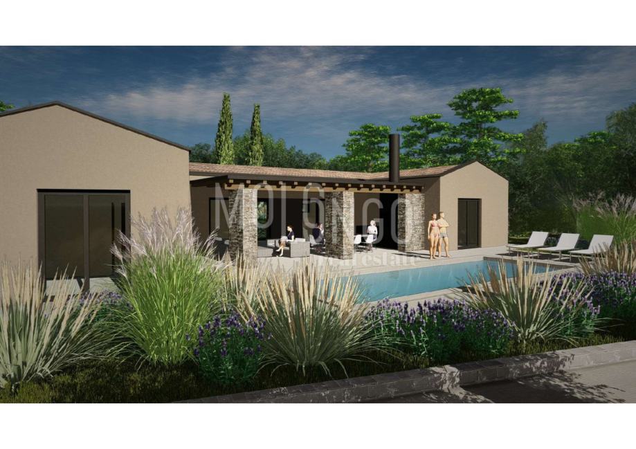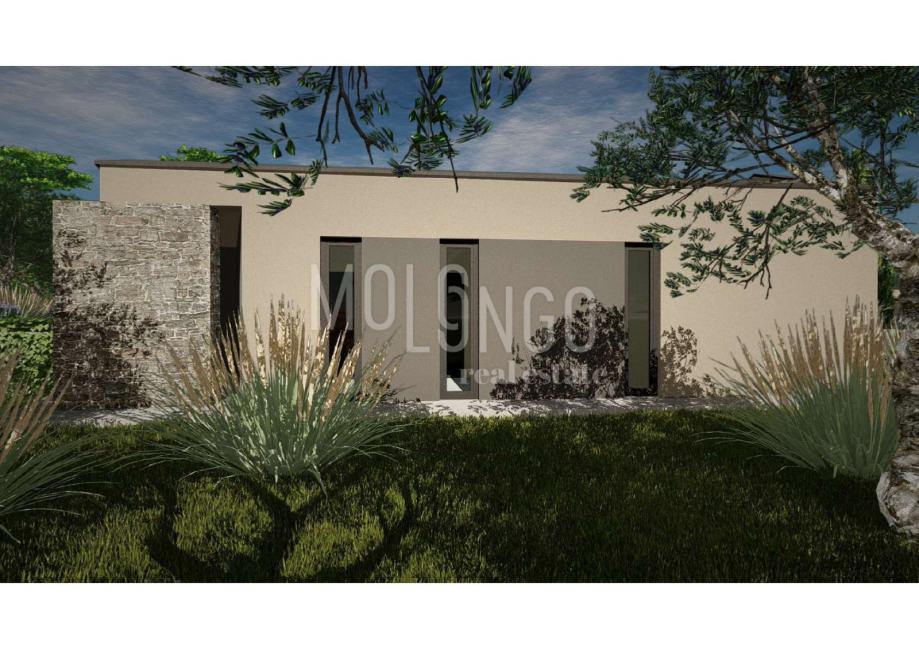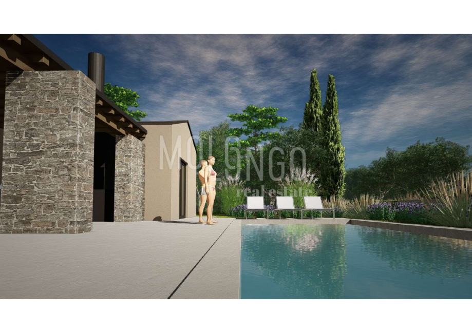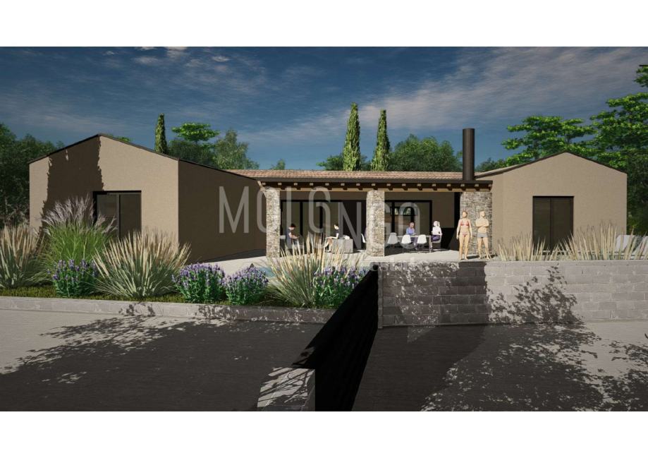 U cijenu je uključen idejni projekt moderne mediteranske vile od 129 m2 stambenog prostora s prostranim terasama i bazenom od 38 m2. Projekt spaja suvremeni dizajn i tradicionalni šarm, koristeći prirodne materijale poput kamena i drva, a velika staklena stijena povezuje interijer s prirodom i bazenom.