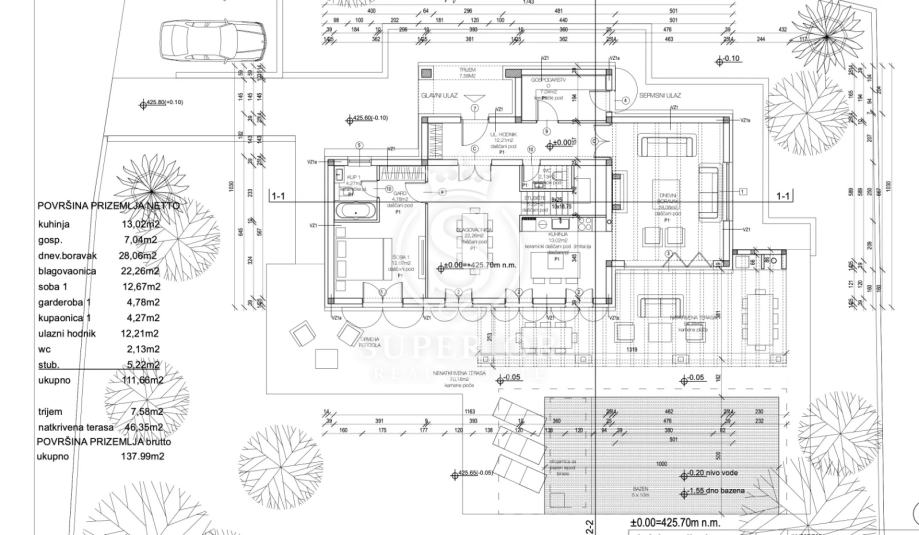 Ukupna stambena površina iznosi 170 m², uz dodatnih 80 m² natkrivenih terasa, a sve se nalazi na prostranoj parceli površine cca 1.000 m². Otvoreni pogledi prema zelenilu i bazenu dostupni su kako iz prizemlja, tako i s kata.