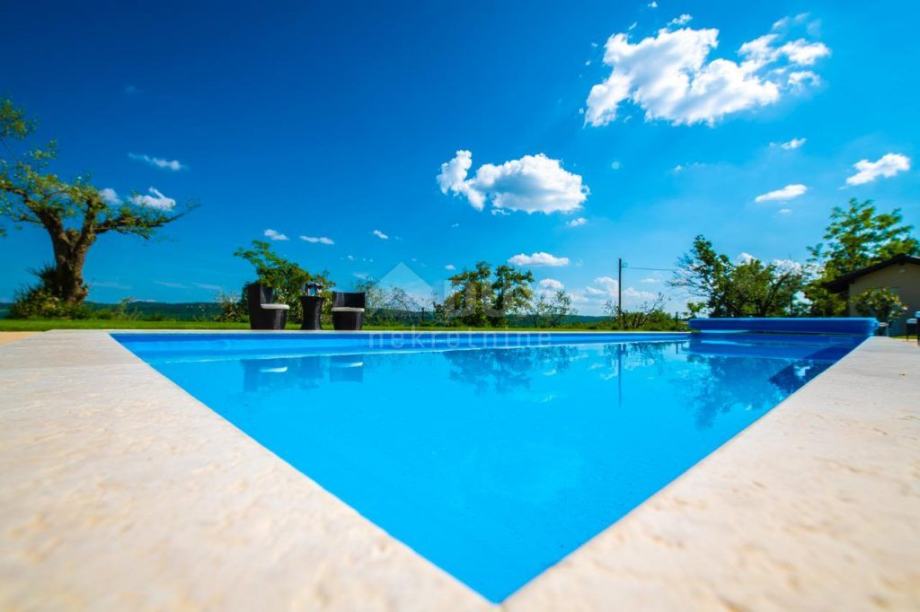 Na kompletno ograđenoj i uređenoj okućnici površine 1.721m2 smjestio se natkriveni parking sa 2 parkirna mjesta i alatnicom, solarno grijani bazen površine 14x4.5m i 3objekta; vila (148m2) , gostinjska kuća (50m2) i vrtna ostava (22m2).