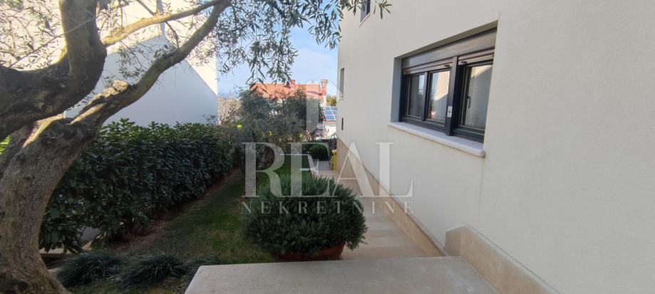 Kuća ima pristup s ceste te se s prednje strane nalaze parkirna mjesta kao i ulaz u veliku i prostranu garažu. Uz stepenice, prema dvorištu i ulasku u kuću, nalazi se prostrani wellness prostor sa saunama i kupaonicom. Prostor je zamišljen kao relax zona u kojoj se nalaze saune, kupaonica kao i međuprostor u kojem se može uživati čitajući knjigu ili odmarajući uz ugodno glazbu i intimnu atmosferu.