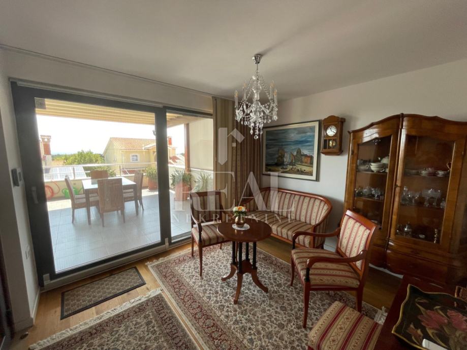 Ulaskom u kuću dolazi se u otmjeni pred prostor na kojem se nalazi set sjedećih garnitura s pratećim komodama i stolom rustikalnog dizajna i visoke kvalitete. Iz tog dijela izlazi se i na terasu s koje se pruža pogled na more. Na terasi se nalaze tende na senzor koje se u slućaju oluje i vjetra same zatvaraju. Prolaskom tog šarmantnog kutka ulazi se u prostrani hodnik koji vodi prema ostalim prostorijama. U donjem dijelu kuće nalazimo još jednu manju spavaću sobu, kupaonicu, veliki dnevni boravak sa kaminom te kuhinju s blagovaonicom i izlazom na natkrivenu terasu i dvorišni dio, Unutarnjim stepenicama pristupa se gornjem katu kuće na kojoj se nalaze još dvije spavaće sobe, kupaonica te velika terasa s fenomenalnim i jedinstvenim pogledom na more. Na terasi se nalazi kvalitetna pergola sa senzorima za kišu.