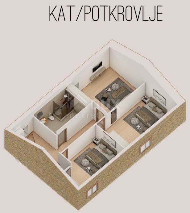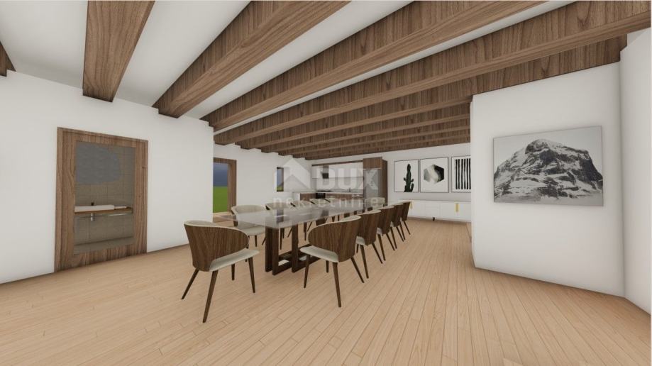 U centru naselja Juršići, u mirnoj, slijepoj ulici, smjestio se ovaj novi projekt troetažne kamene kuće sa bazenom i pomoćnim objektom.