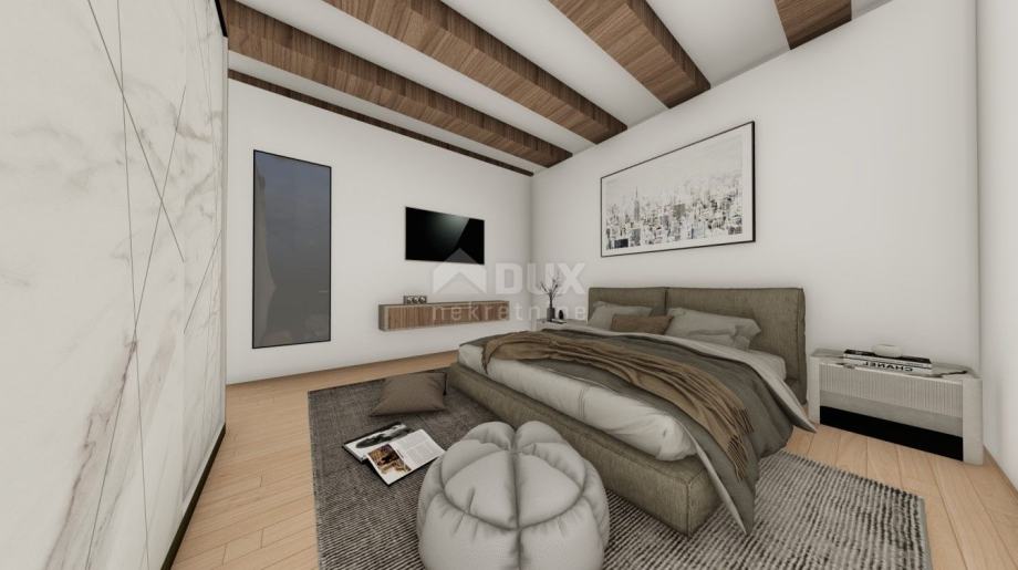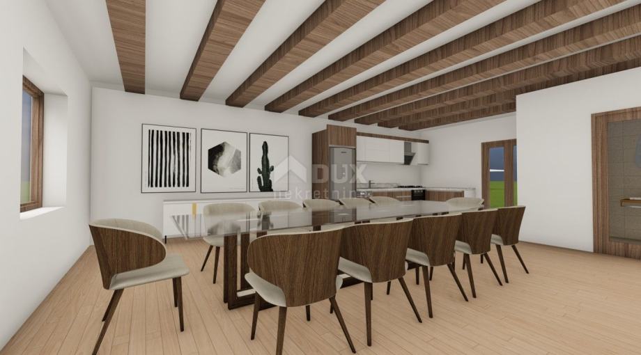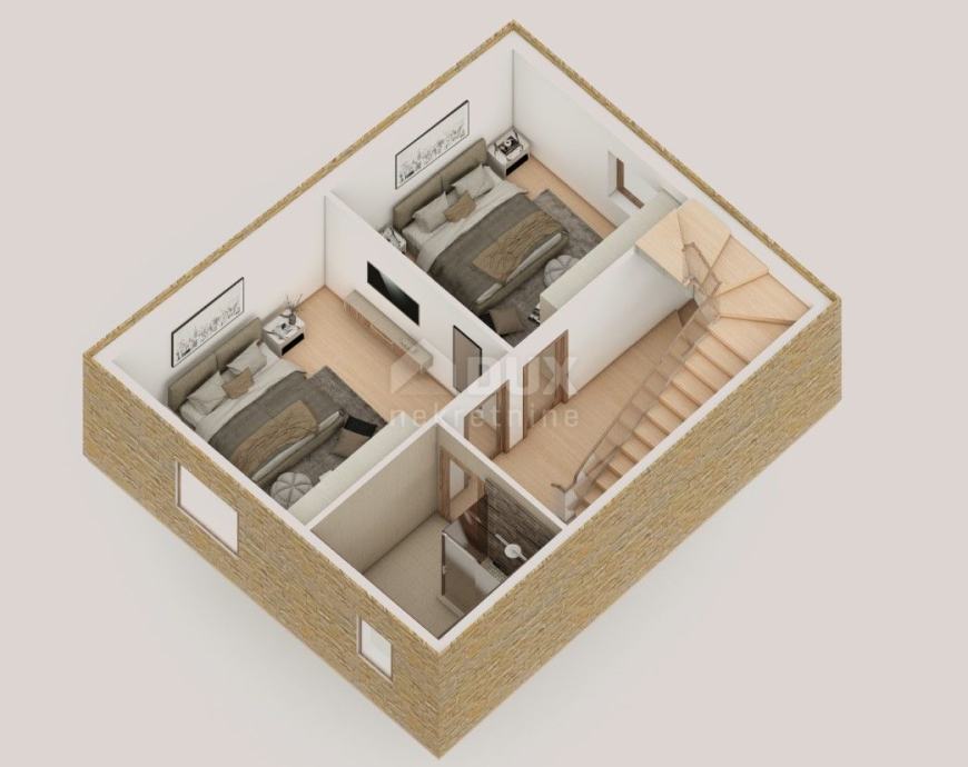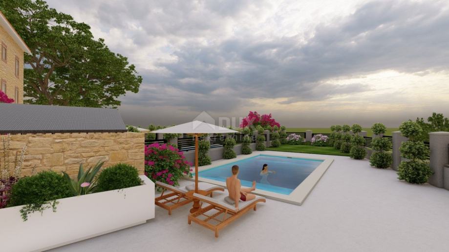 U centru naselja Juršići, u mirnoj, slijepoj ulici, smjestio se ovaj novi projekt troetažne kamene kuće sa bazenom, pomoćnim objektom i spremištem.