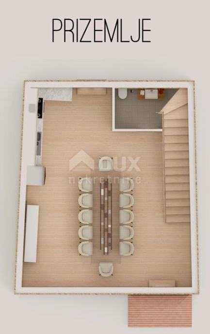 U prizemlju kuće predviđen je dnevni boravak, kuhinja, blagovaonica te manji gostinjski toalet.. U prizemlju se također nalazi izlaz na terasu sa pristupom na bazen.