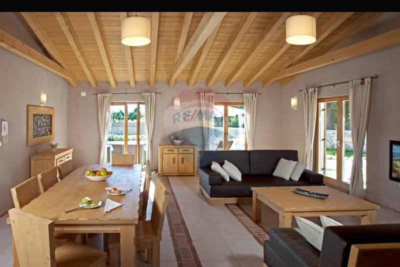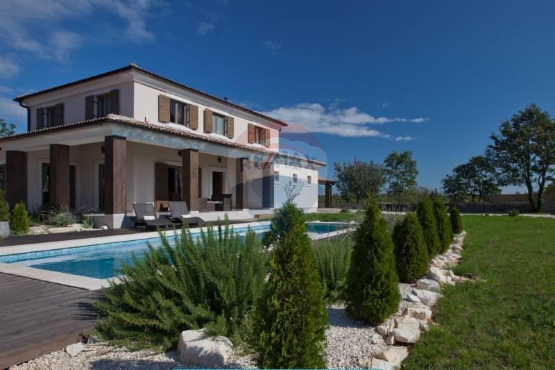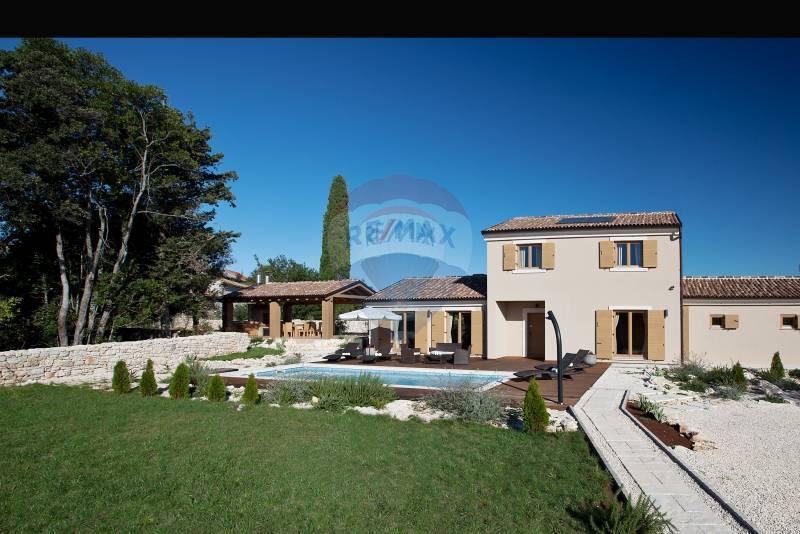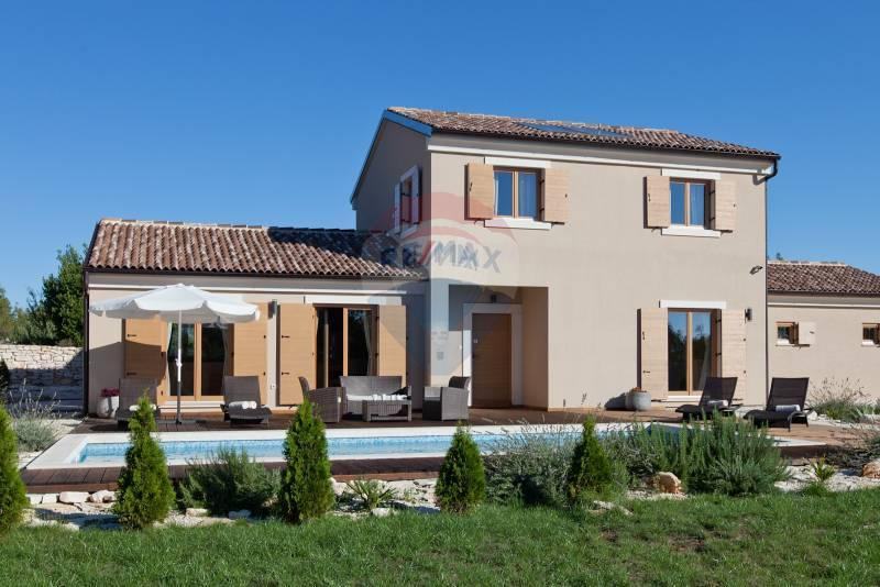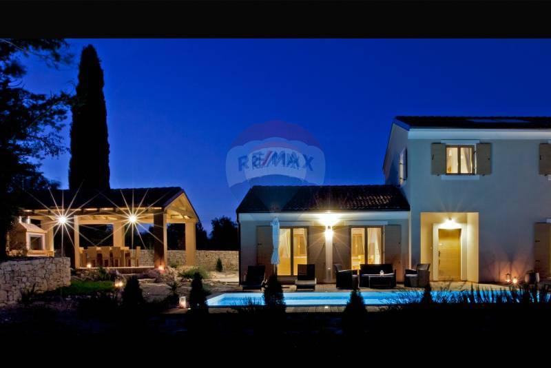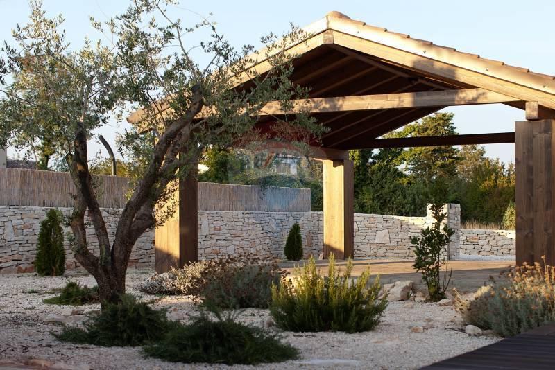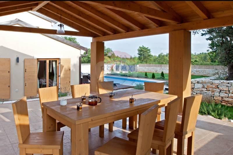 Vanjski prostori su: ljetna kuhinja s roštiljem, blagovaonica uz bazen (36 m2) i natkriveno parkiralište.