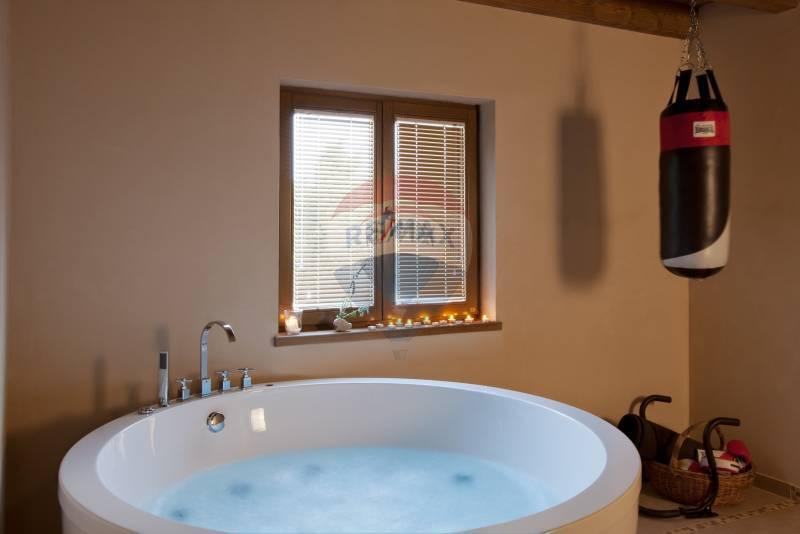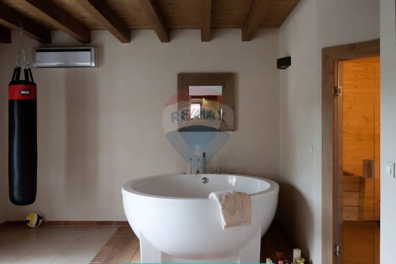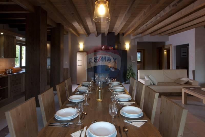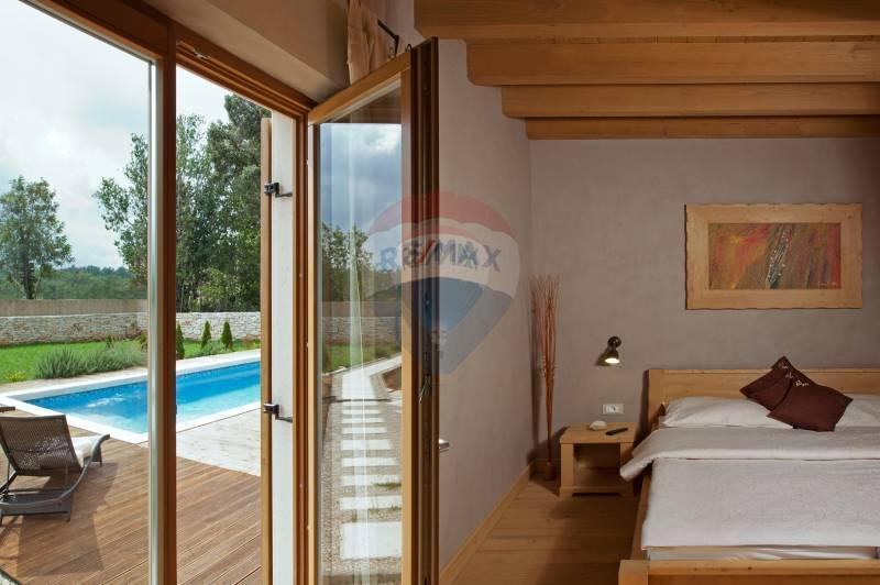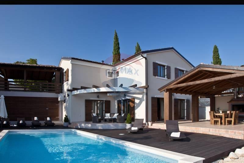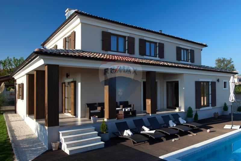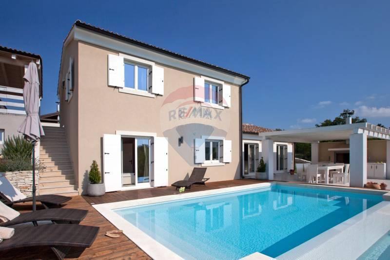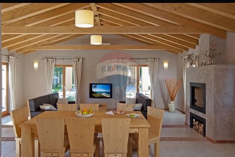 Vanjski prostori su: ljetna kuhinja s roštiljem, blagovaonica uz bazen (36 m2) i natkriveno parkiralište.