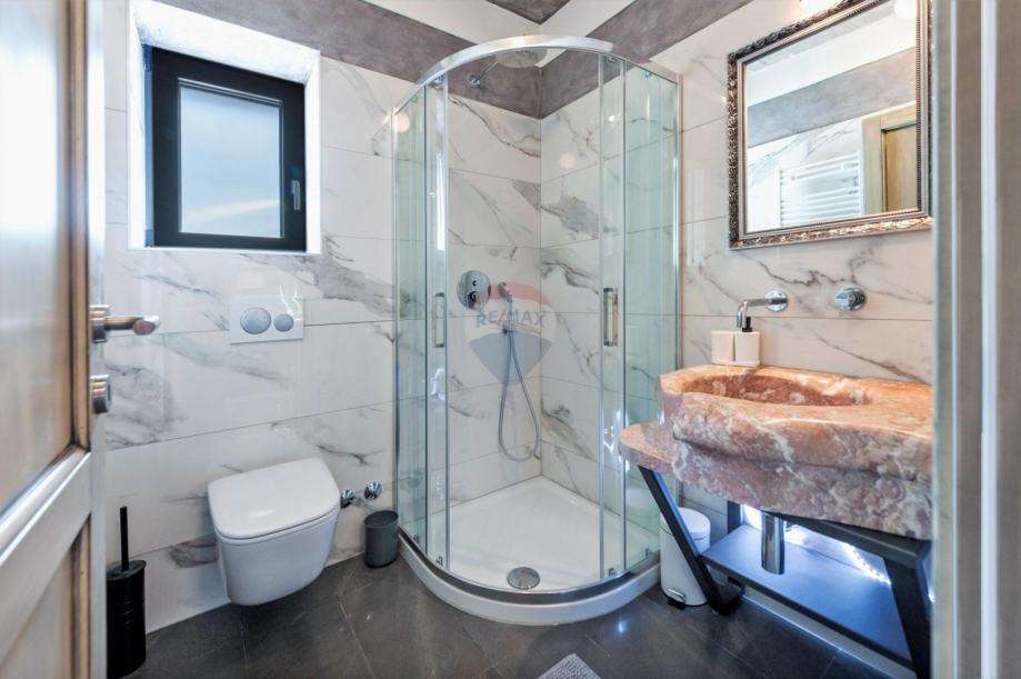 Na uređenoj i ograđenoj okućnici se nalazi bazen površine 26m2 sa slanom vodom bez klora s hidromasažnom klupom te slapom, sunčalište, ljetna kuhinja, roštilj te 4 parkirna mjesta.