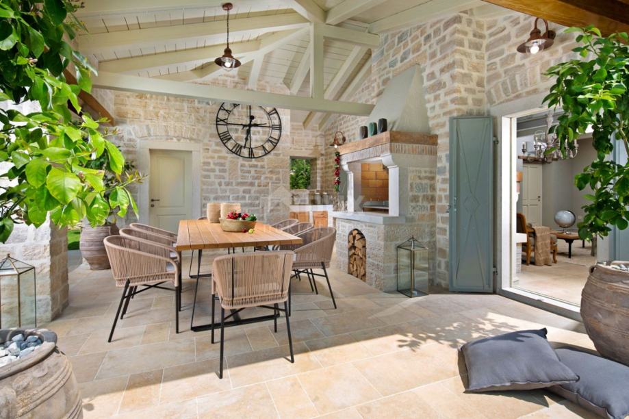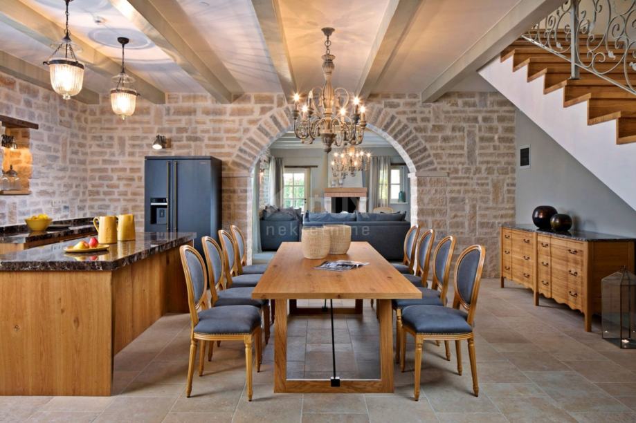 Sofisticirana, luksuzna vila sva obložena kamenom se oblikovno i koloristički uklopa u naselje i krajolik.