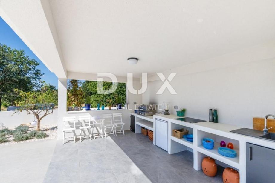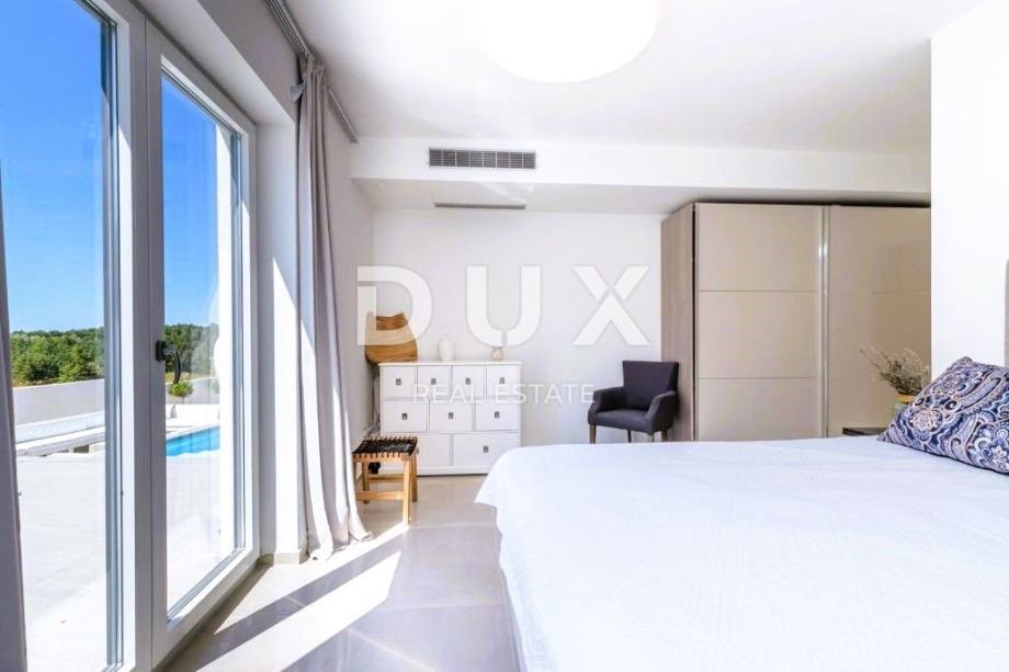Na okućnici od 1000m2 smjestila se ova moderno uređena kuća koja se prostire kroz dvije etaže, prizemlje i prvi kat, ukupne stambene površine od 250m2. U prizemlju se nalazi prostrani dnevni boravak s kuhinjom i blagovaonicom, jedna spavaća soba s vlastitom kupaonicom te gostinjski wc. Prizemlje ove prekrasne kuće osim kvalitetnog namještaja koji je rađen po mjeri krase i pločice talijanskog dizajna, a kroz cijelu kuću provedeno je podno grijanje na toplinsku pumpu, dok je u dnevnom boravku dodatno postavljen i kamin koji nudi poseban ugođaj za vrijeme zimskih mjeseci. Iz dnevnog dijela direktno se izlazi na okućnicu i bazen gdje možete uživati u suncu. Unutarnjim stepeništem od bračkog kamena dolazi se na kat gdje su se smjestile još tri spavaće sobe s vlastitim kupaonicama. Jedna od soba ima i svoju vlastitu terasu s koje se proteže pogled u daljinu i na more. Sve kupaonice imaju ručno rađene umivaonike te su staklene stijene od tuša pomične za maksimalnu komfornost.