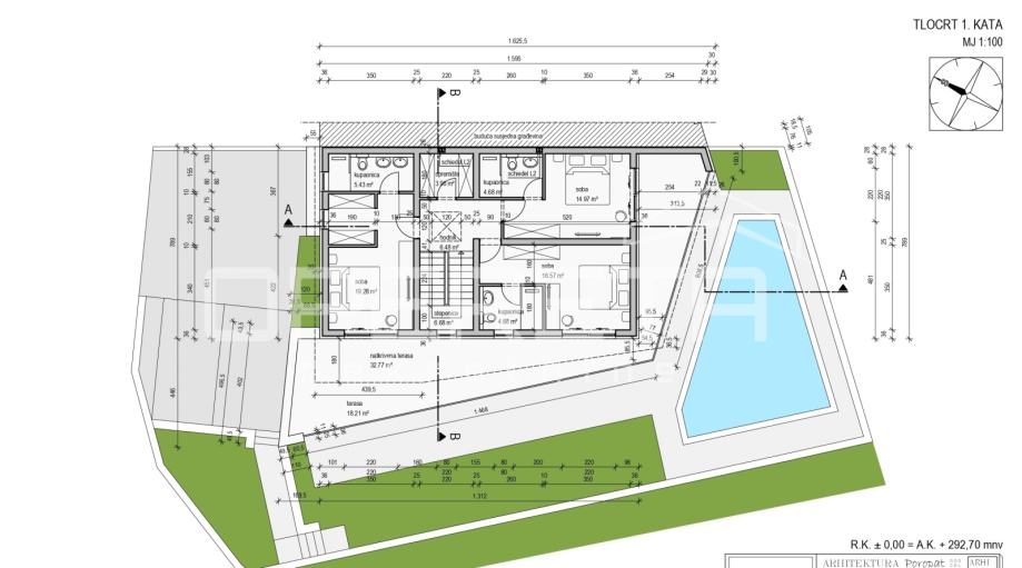 Na katu su smještene tri komforne spavaće sobe, svaka s vlastitom kupaonicom i izlazom na terasu, te ostava, što pruža dodatnu razinu privatnosti i udobnosti.