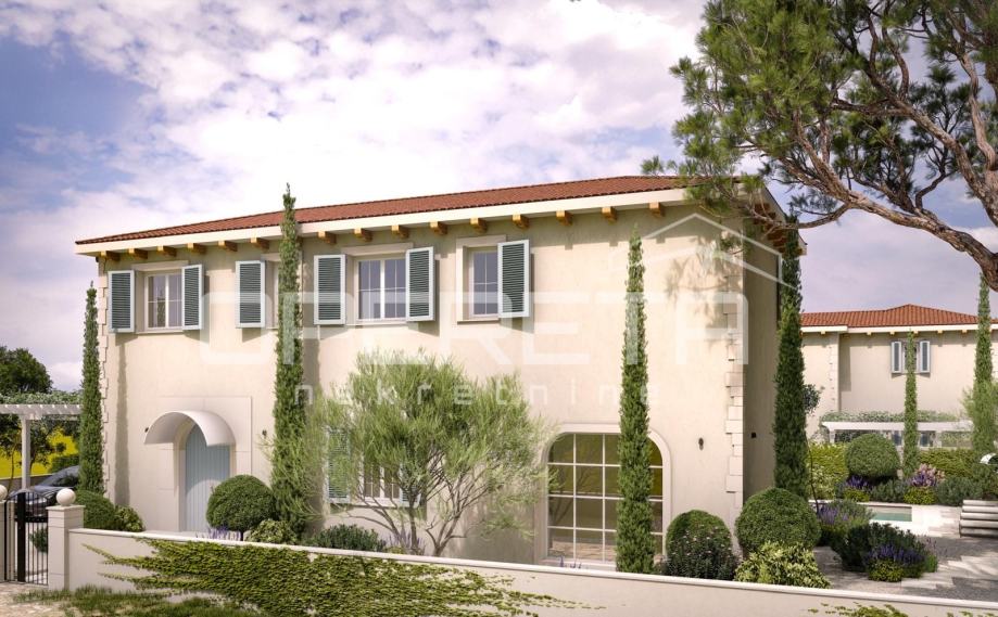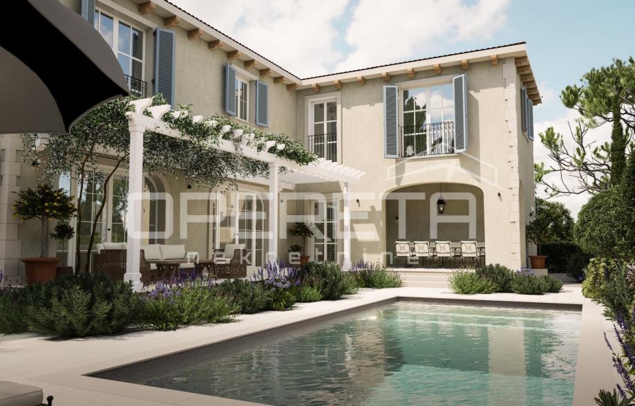Projekt zamišljen kao velebna vila za odmor s bazenom u francuskom stilu spoja moderne arhitekture i tradicionalnih materijala