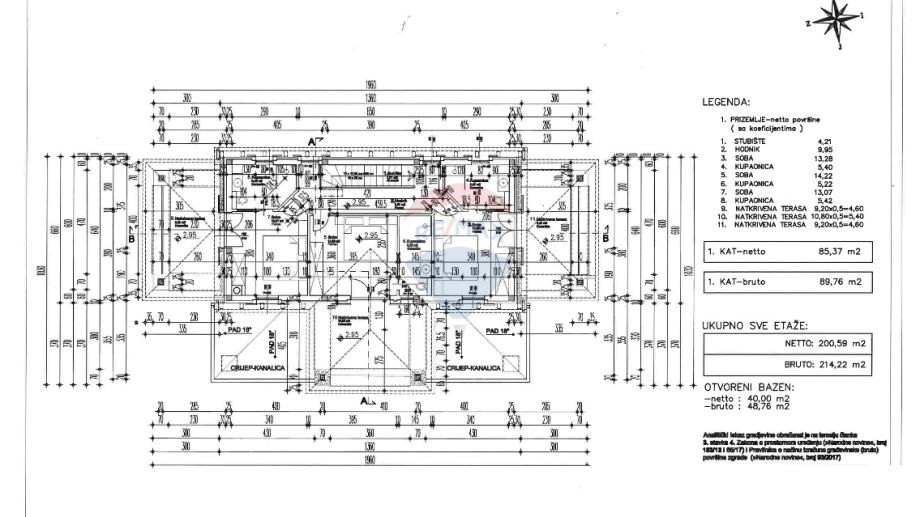 Kuća je ukupne površine 215 m2 a proteže se na dva kata te ljetna kuhinja od 50 m2.