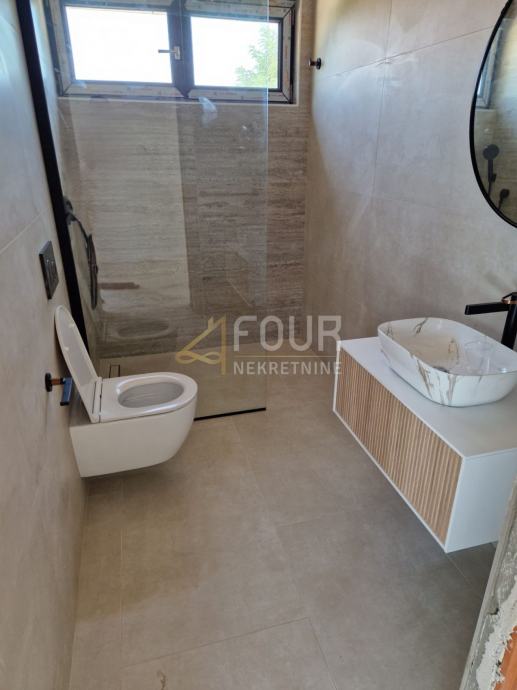 Kuća je izgrađena s vrhunskim materijalima i opremom, uključujući troslojnu aluminijsku i PVC stolariju, kvalitetnu keramiku, fasadu sa stiroporom debljine 12 cm te mediteranski krov.