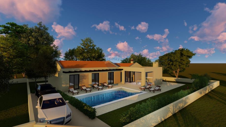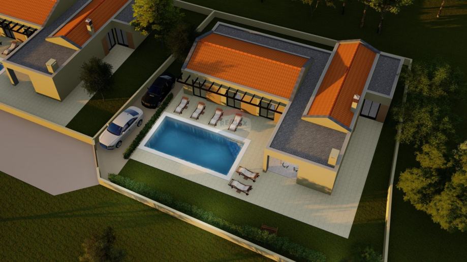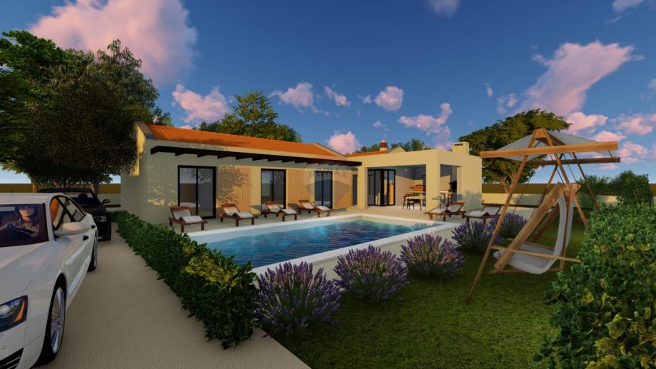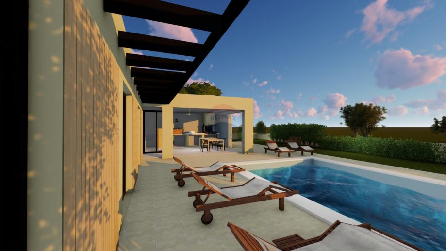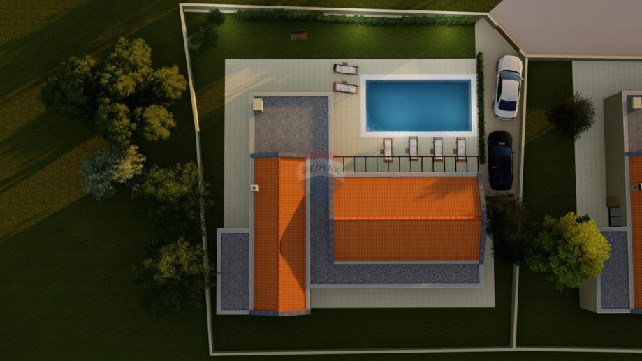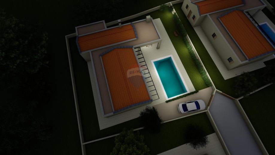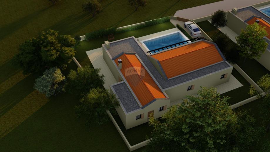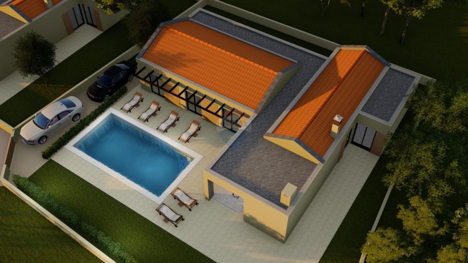 Kuća se sastoji od dnevnog boravka, kuhinje i blagovaone, 3 spavaće sobe sa 3 kupatila i wc-om te natkrivenom terasom. U nastavku se nalzi bazen od 37m2.